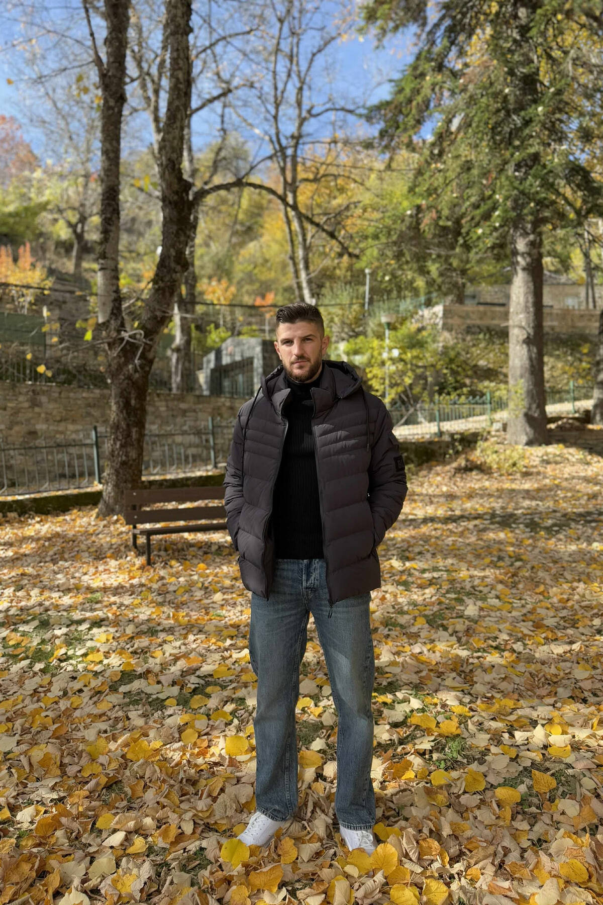 NECK AND BOTTOM BELTED FLUFFY MEN PUFFER JACKET BLACK/ E ZEZE