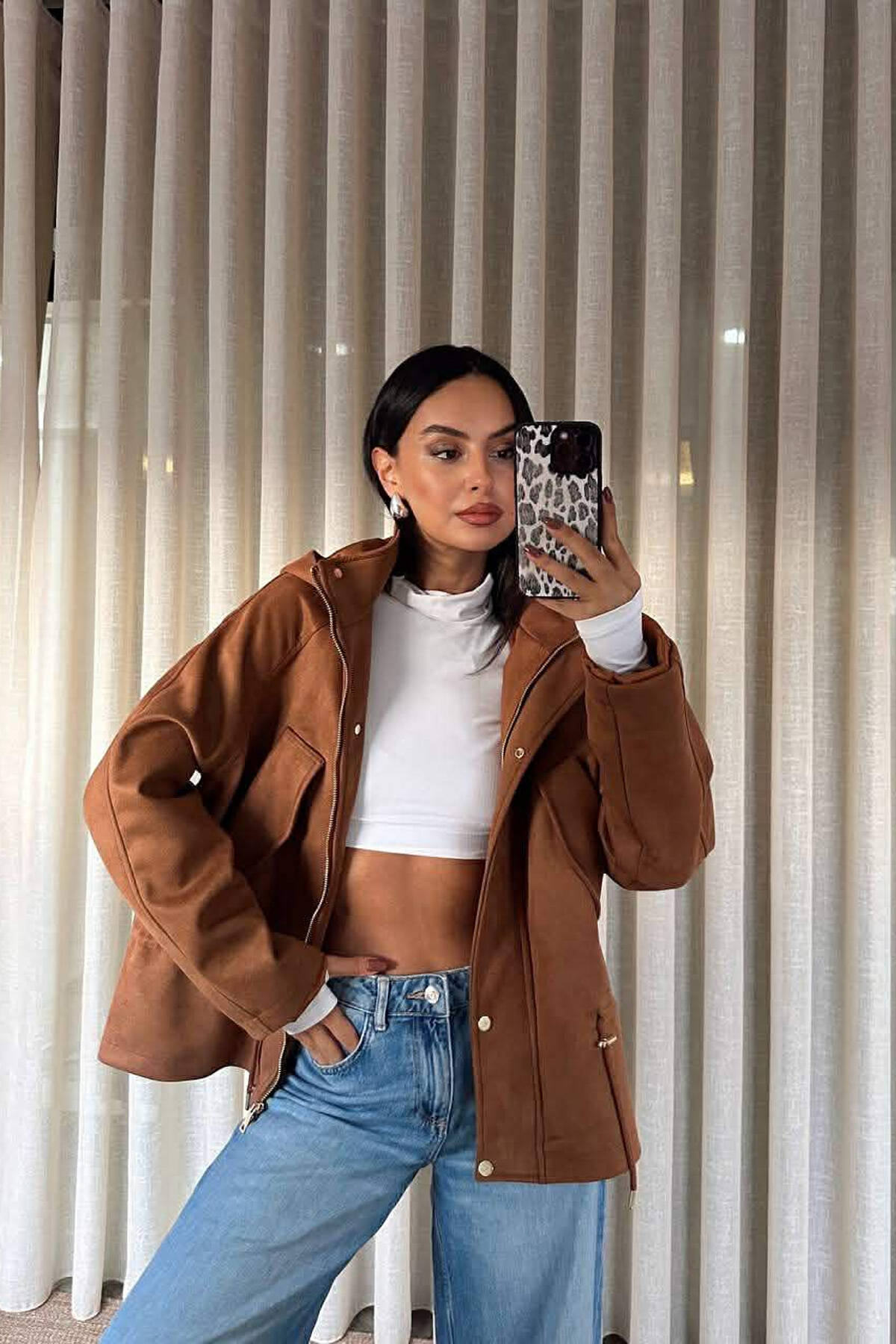ONE COLOR SUEDE SIMPLE WOMEN JACKET BROWN/KAFE