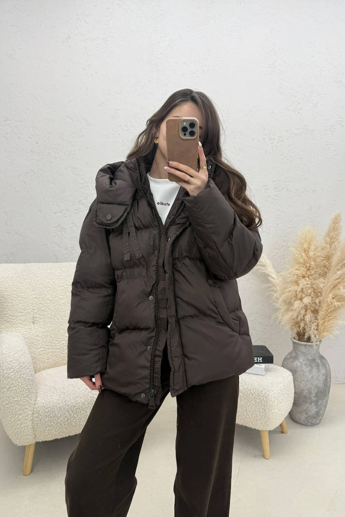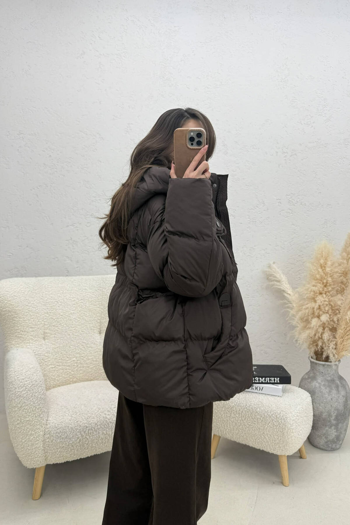 ONE COLOR HOODED ZIPPER WOMAN PUFFER JACKET BROWN/KAFE