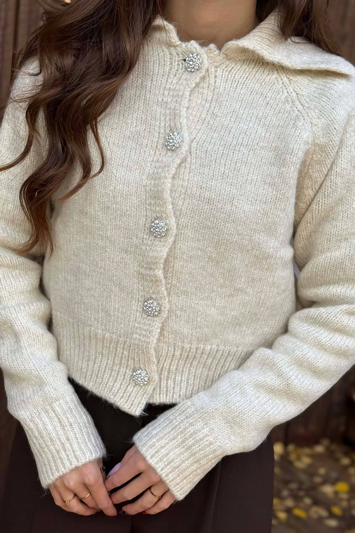 ONE COLOR KNITTED DIAMOND DETAIL BUTTONS WOMEN CARDIGAN BEIGE/BEZHE