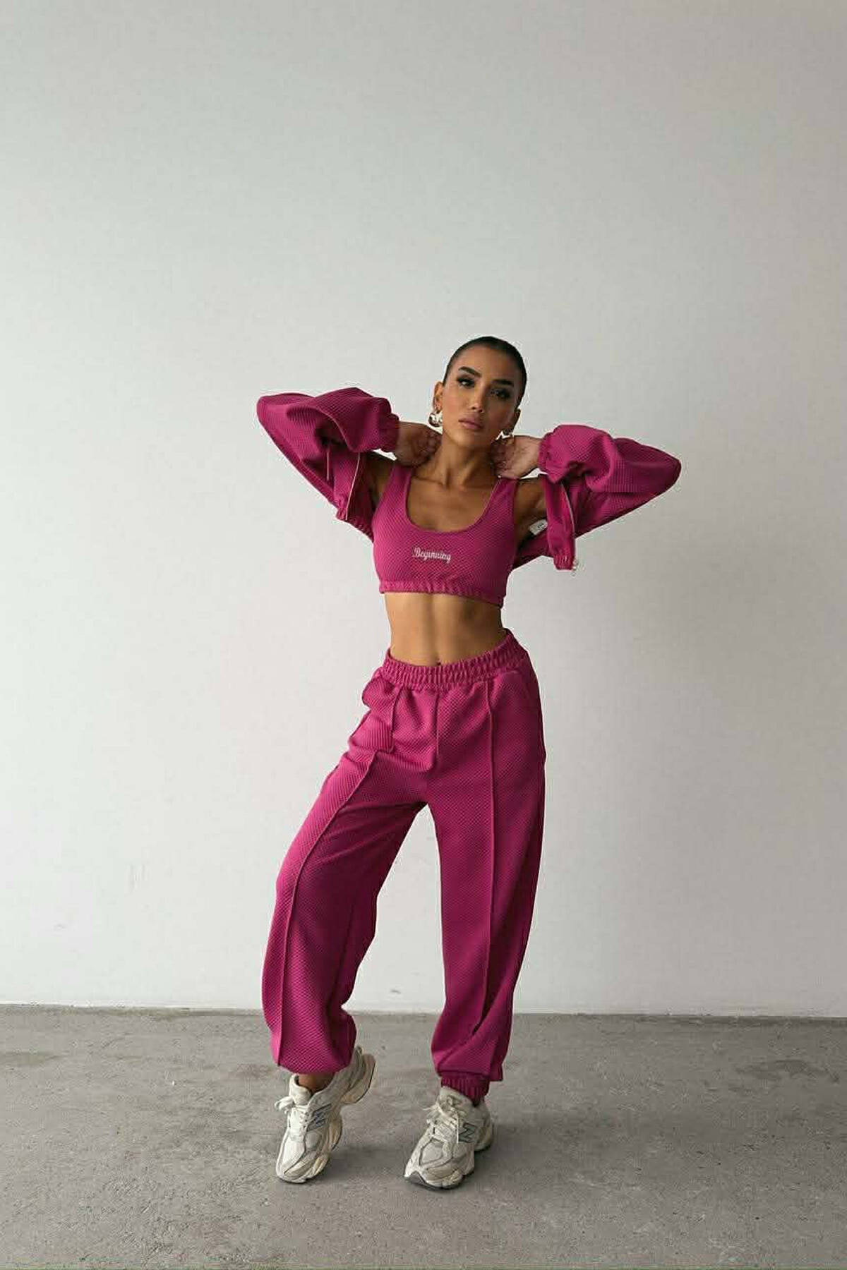 ONE COLOR KNITTED FABRIC JACKET+BRA+JOGGERS WOMEN SET FUCHSIA/CIKLAMI