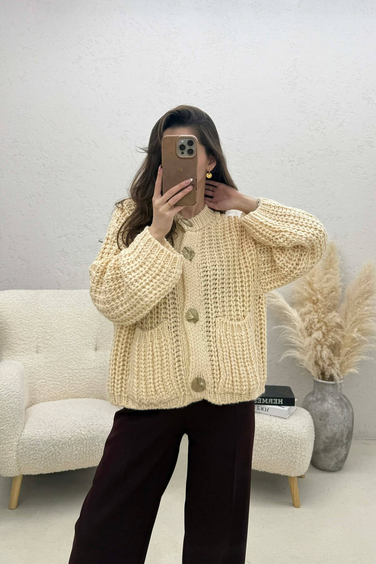 ONE COLOR KNITTED FRONT POCKETS WOMEN CARDIGAN CREAM/KREM