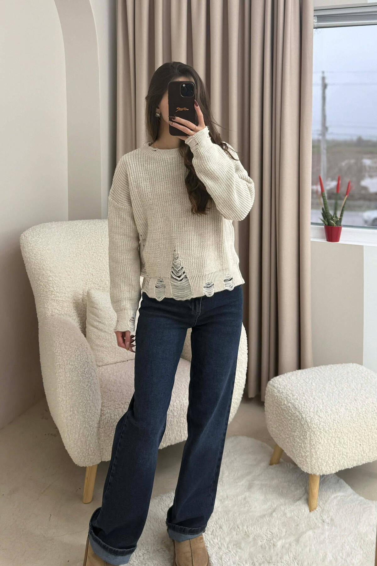 ONE COLOR KNITTED RIPPED DESIGN WOMEN SWEATER CREAM/KREM