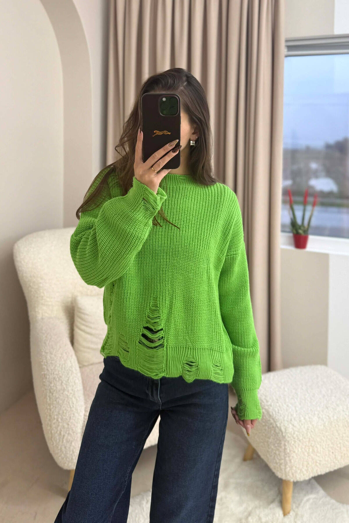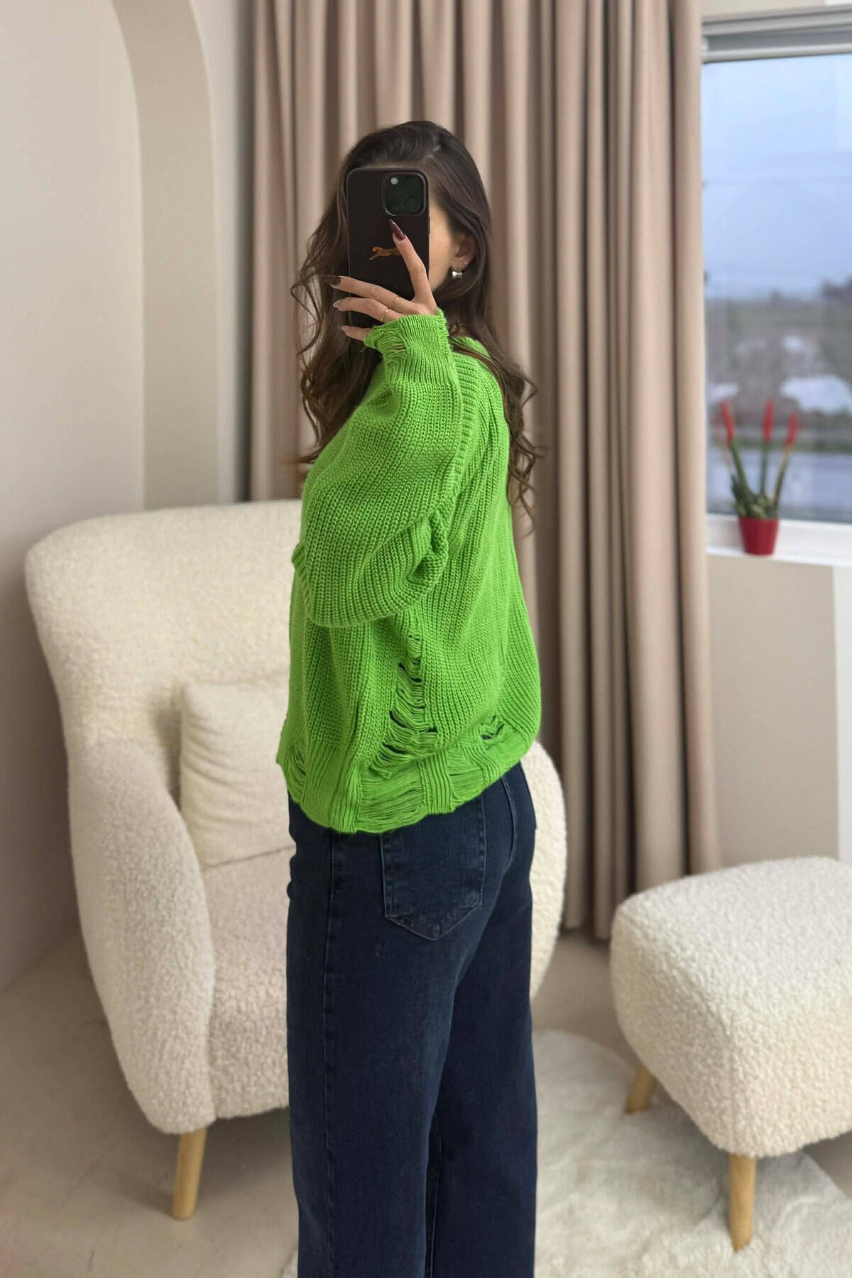 ONE COLOR KNITTED RIPPED DESIGN WOMEN SWEATER LIGHT GREEN/JEZB