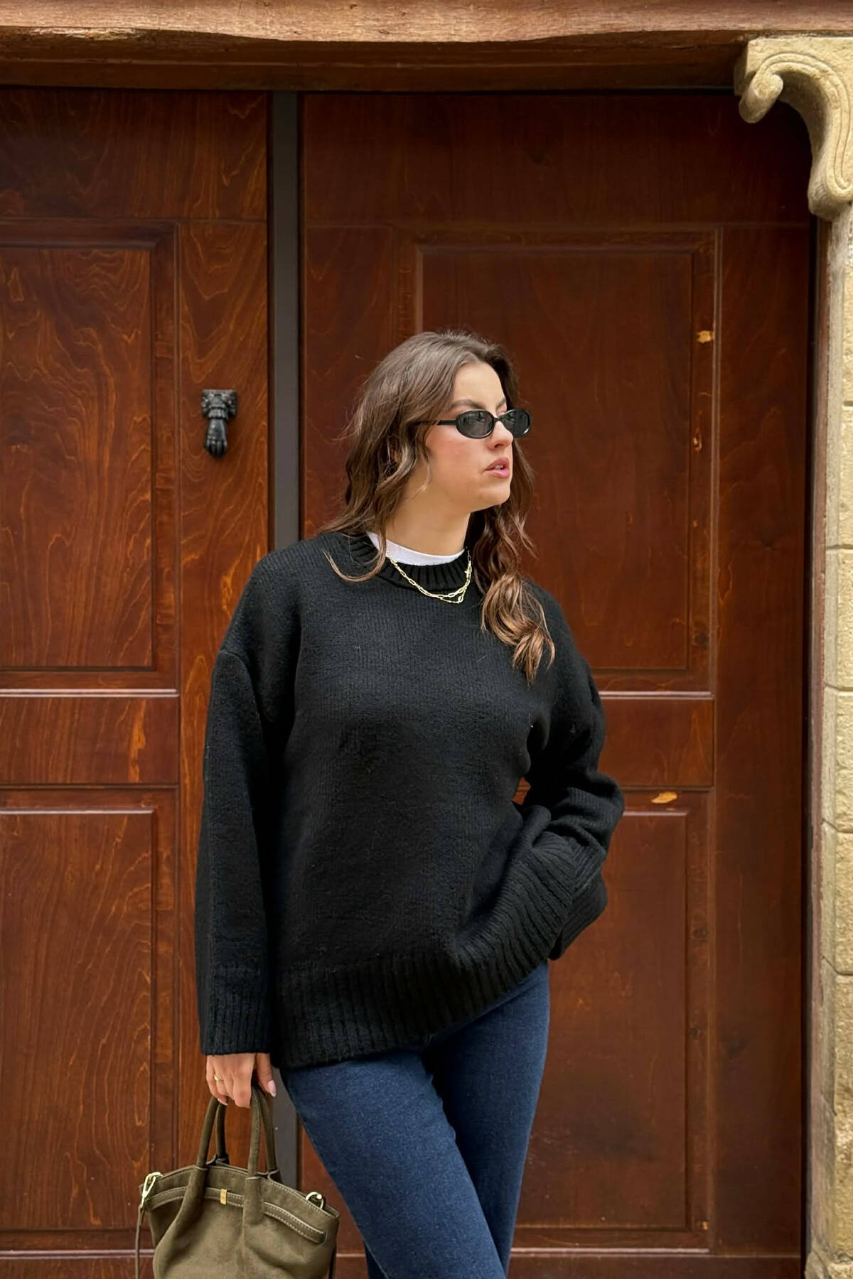 ONE COLOR KNITTED ROUND NECK WOMEN SWEATER BLACK/ E ZEZE