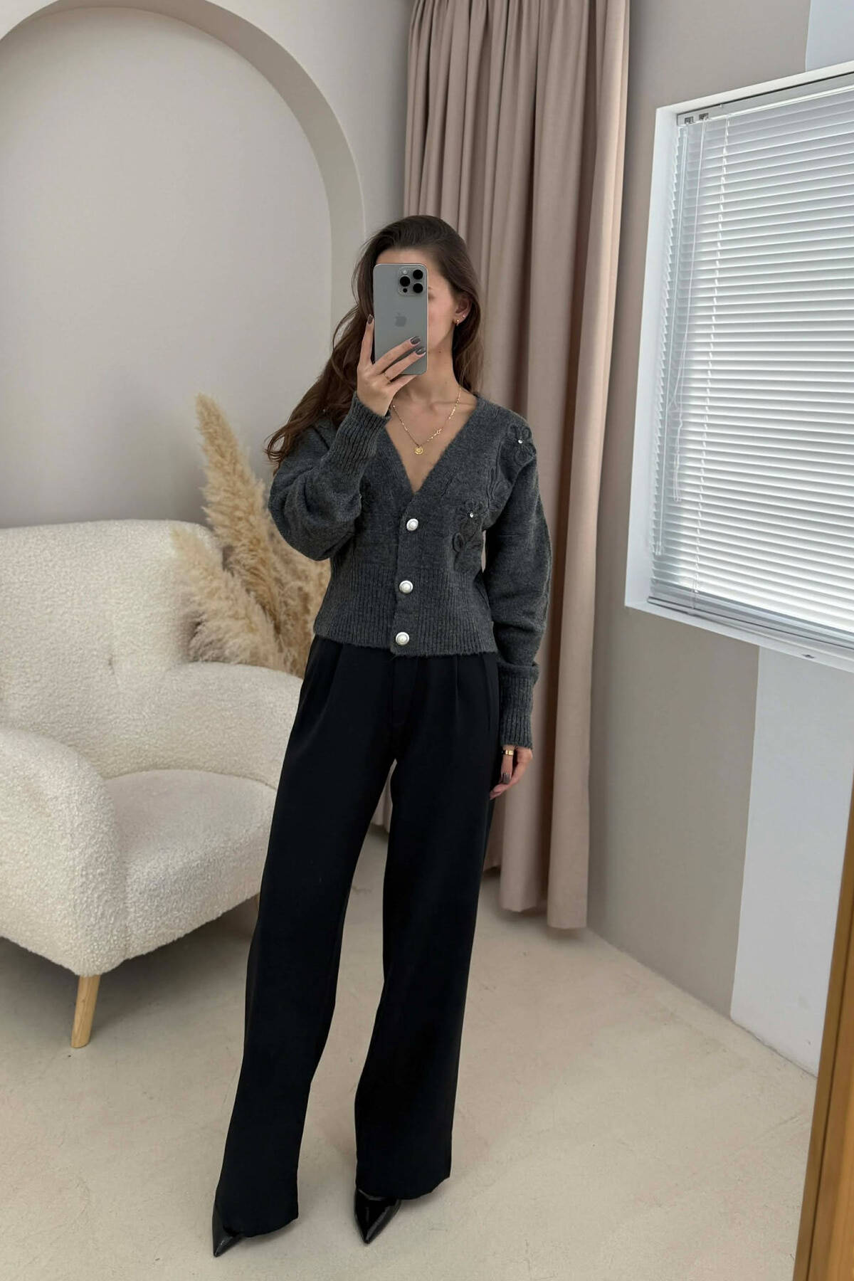 BELT DETAIL BUTTONED WOMEN CARDIGAN DARK GREY/GEE