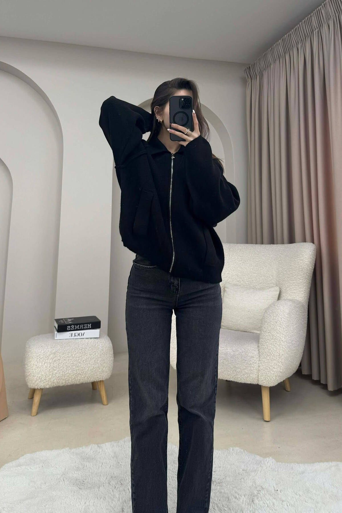 ONE COLOR KNITTED ZIPPER WOMEN CARDIGAN BLACK/ E ZEZE