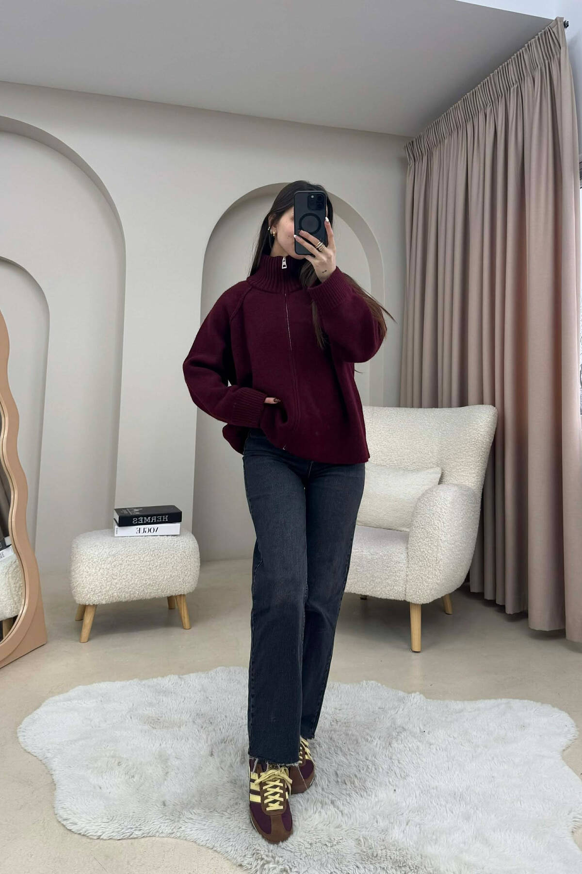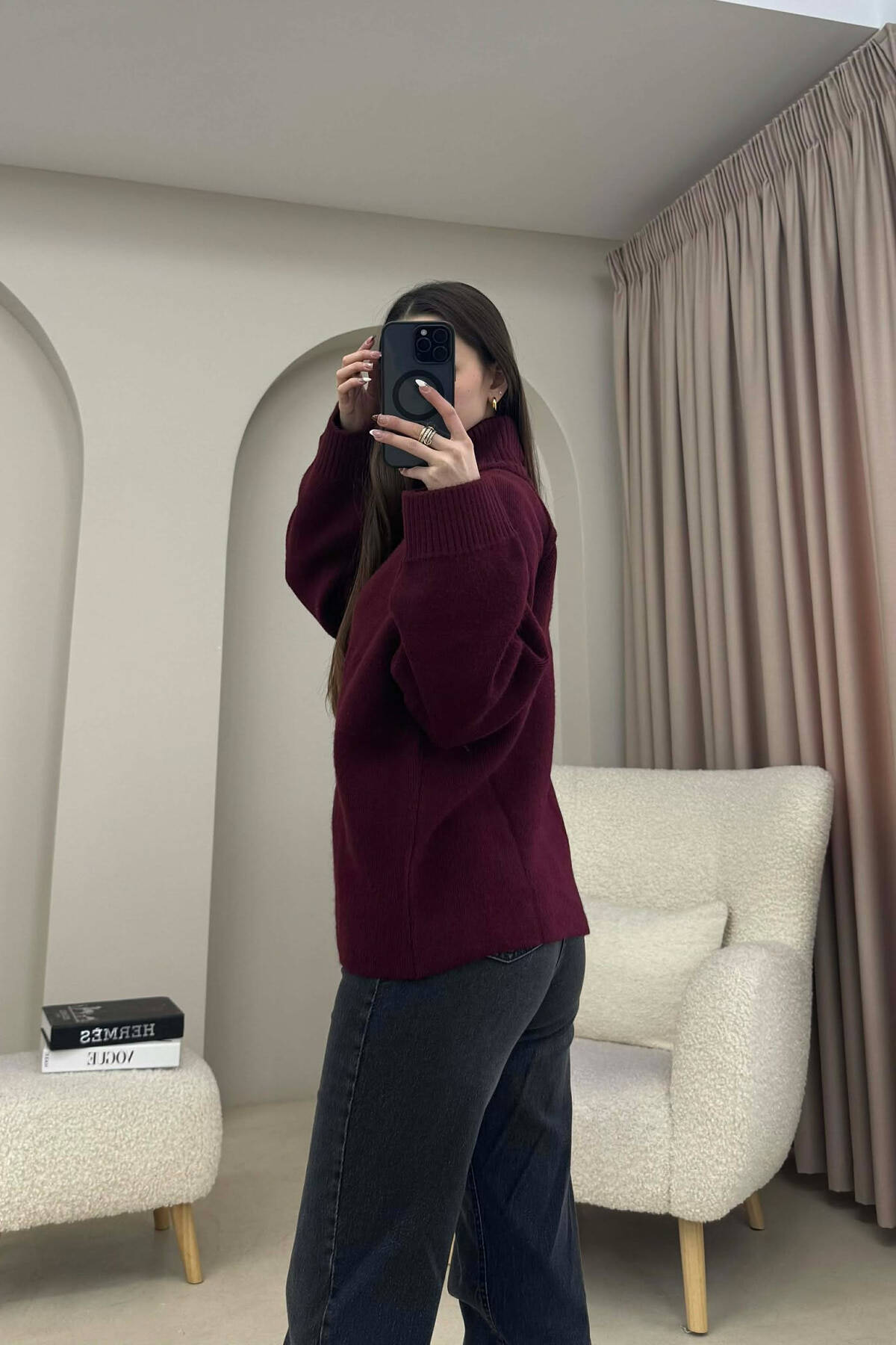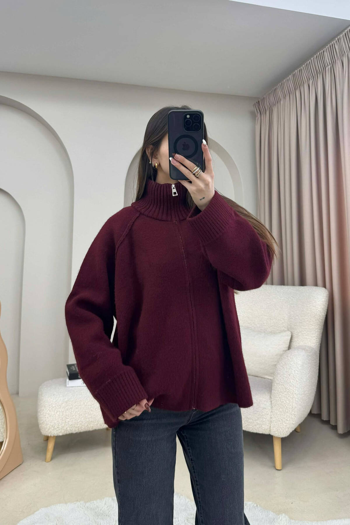 PULOVËR E THURRUR NJË NGJYRËSHE ME ZINXHIR PËR FEMRA NË NGJYRE VISHNJE