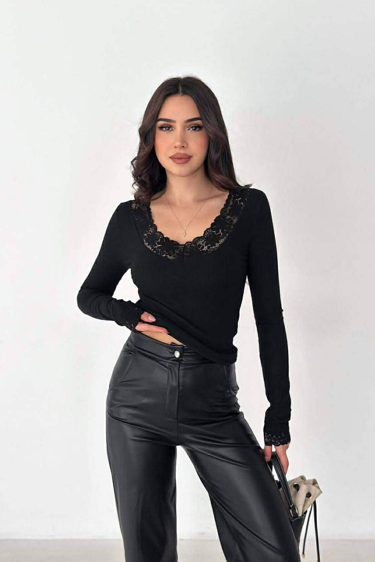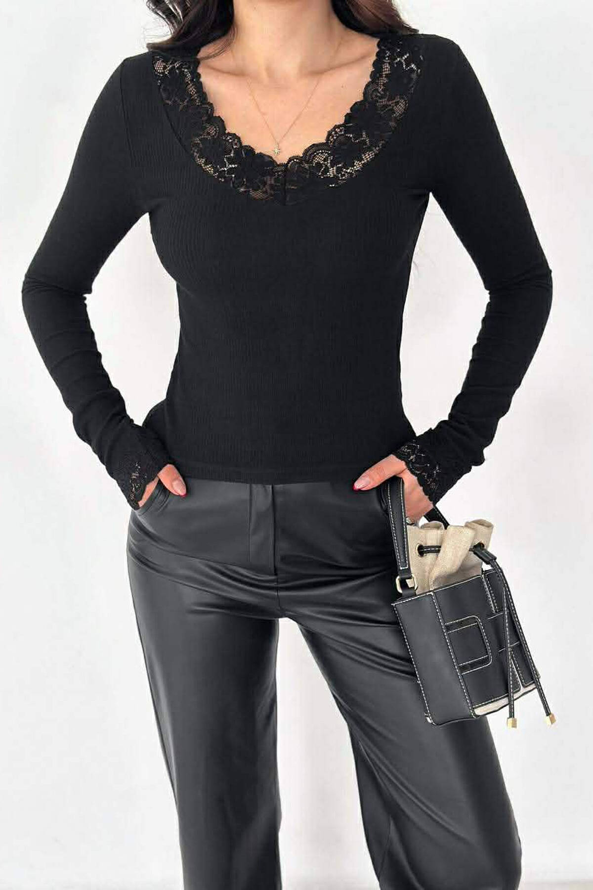 ONE COLOR LACE V-NECK LONG SLEEVE WOMAN SWEATSHIRT BLACK/ E ZEZE