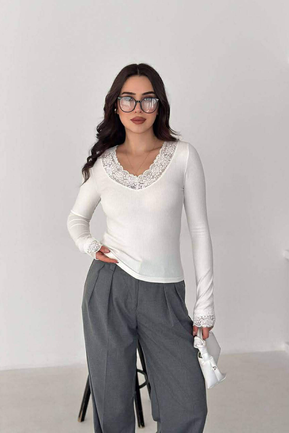 ONE COLOR LACE V-NECK LONG SLEEVE WOMAN SWEATSHIRT WHITE-E BARDHE