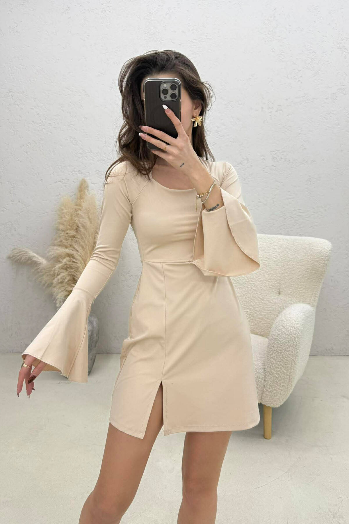 ONE COLOR LACING NECK LONG SLEEVES WOMAN DRESS BEIGE/BEZHE