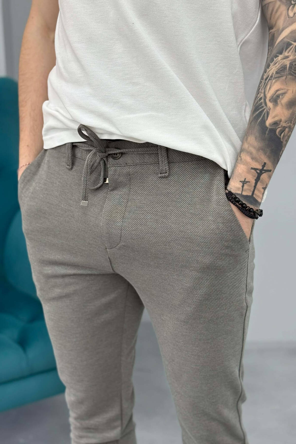 ONE COLOR LACING WAIST SIMPLE MEN PANTS GREY/GRI