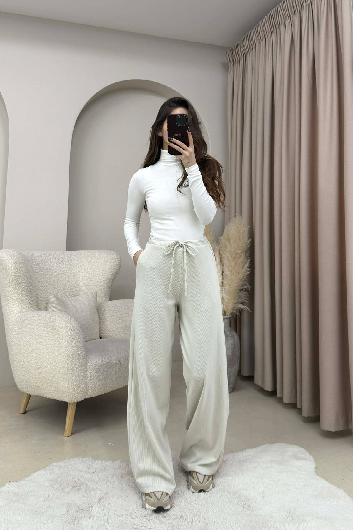 ONE COLOR LACING WAIST WOMEN TROUSERS CREAM/KREM