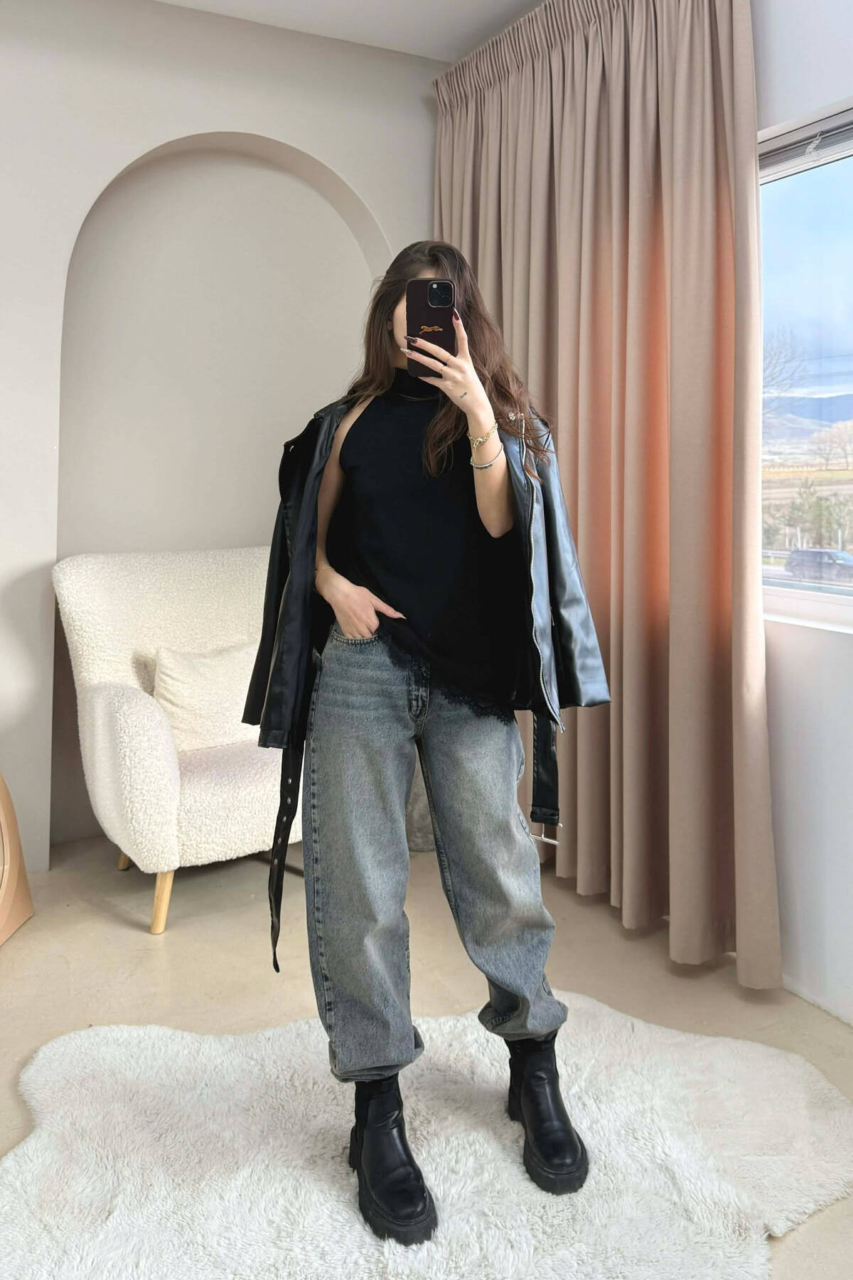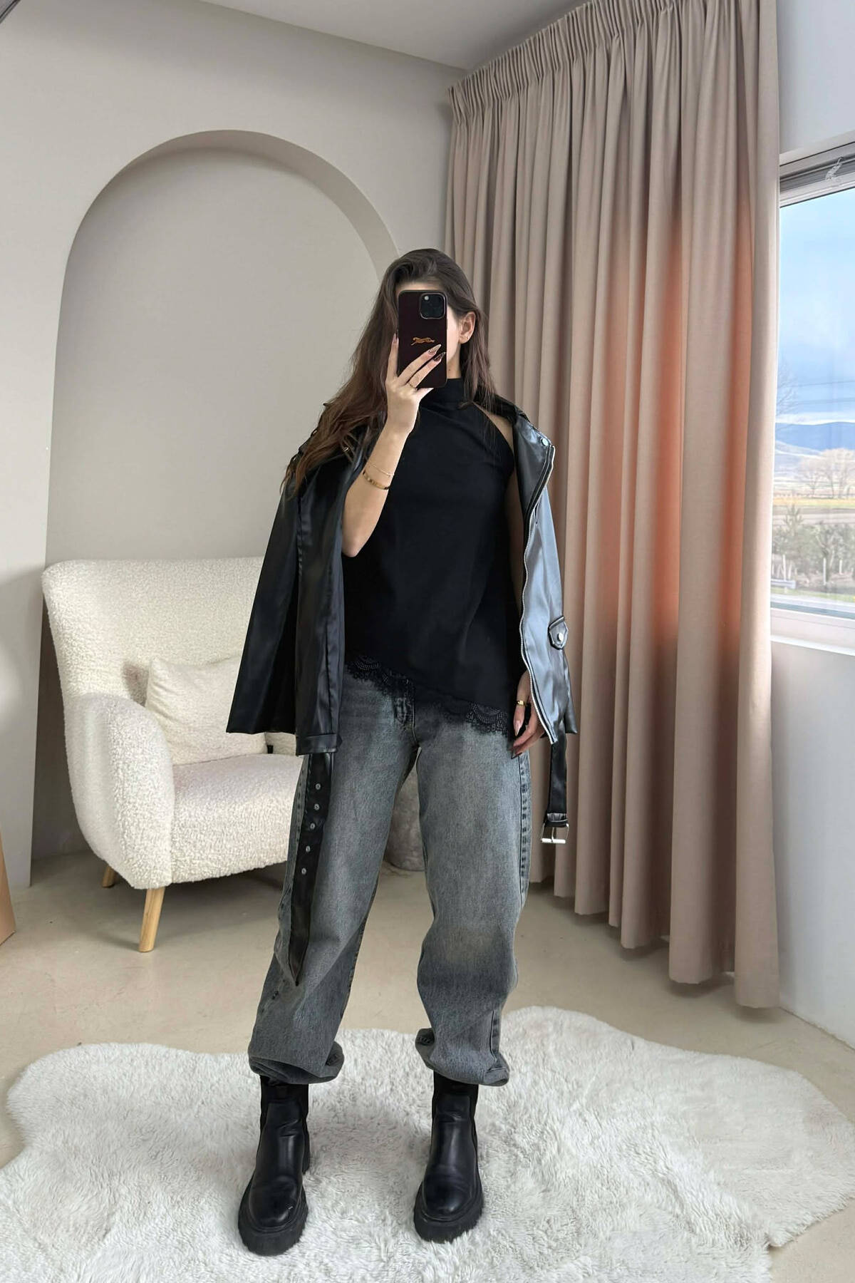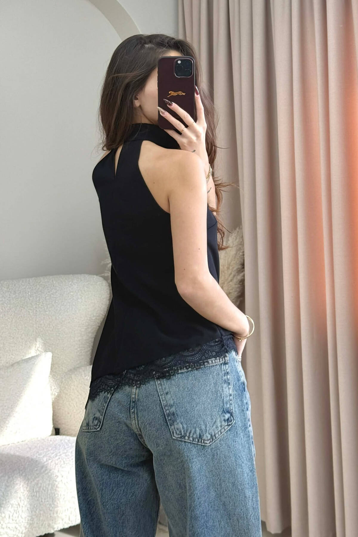 ONE COLOR LACY BOTTOM DESIGN WOMEN TANK TOP BLACK/ E ZEZE