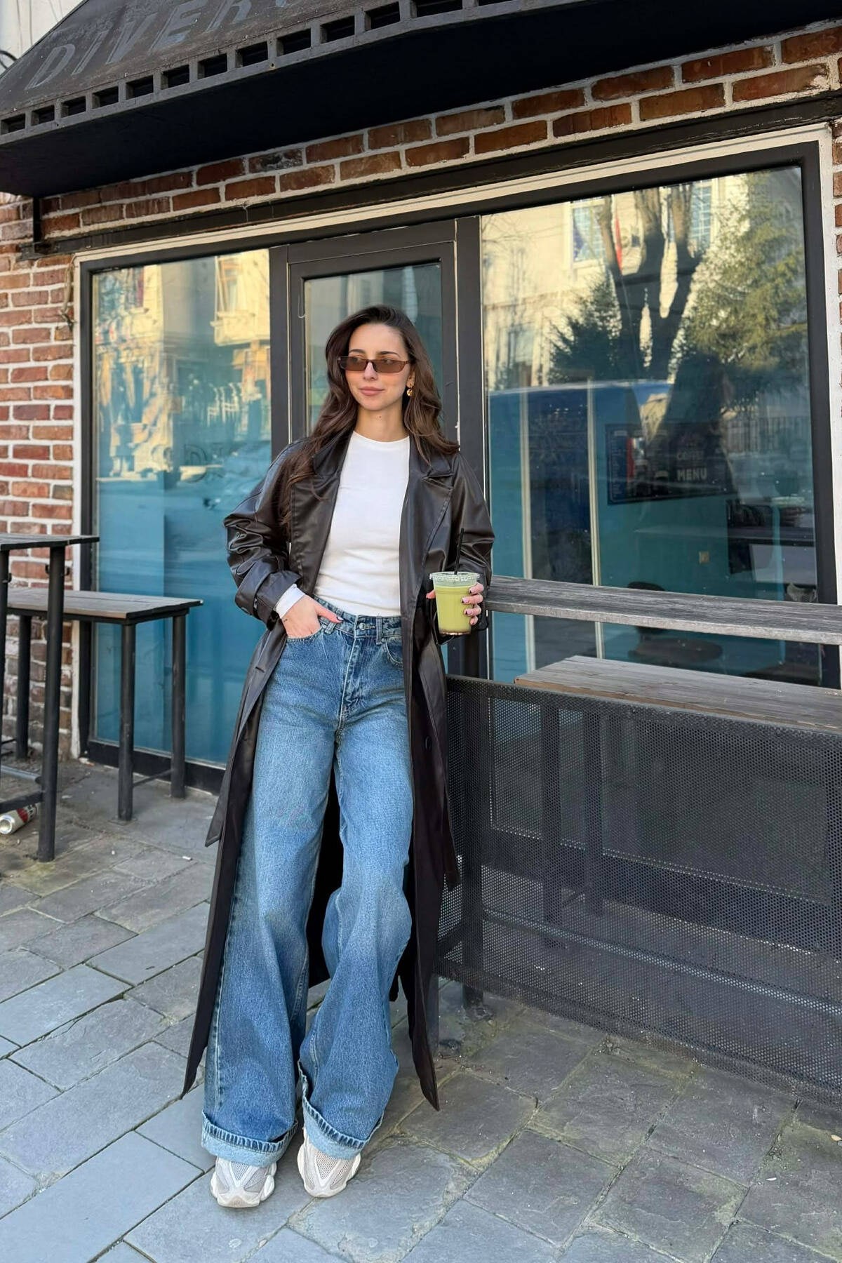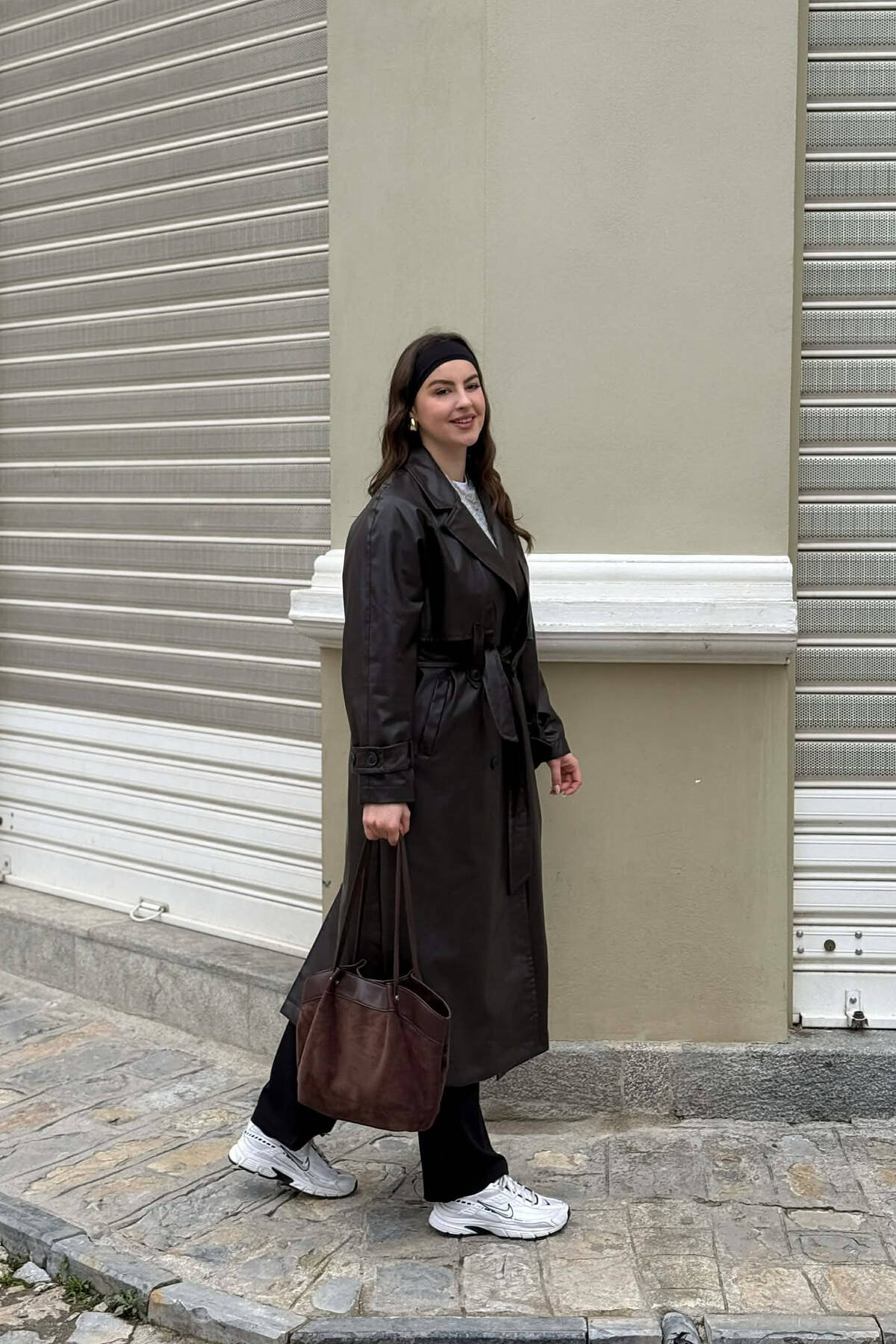 ONE COLOR LEATHER BUTTONED BELT DETAIL LONG WOMAN COAT BROWN/KAFE