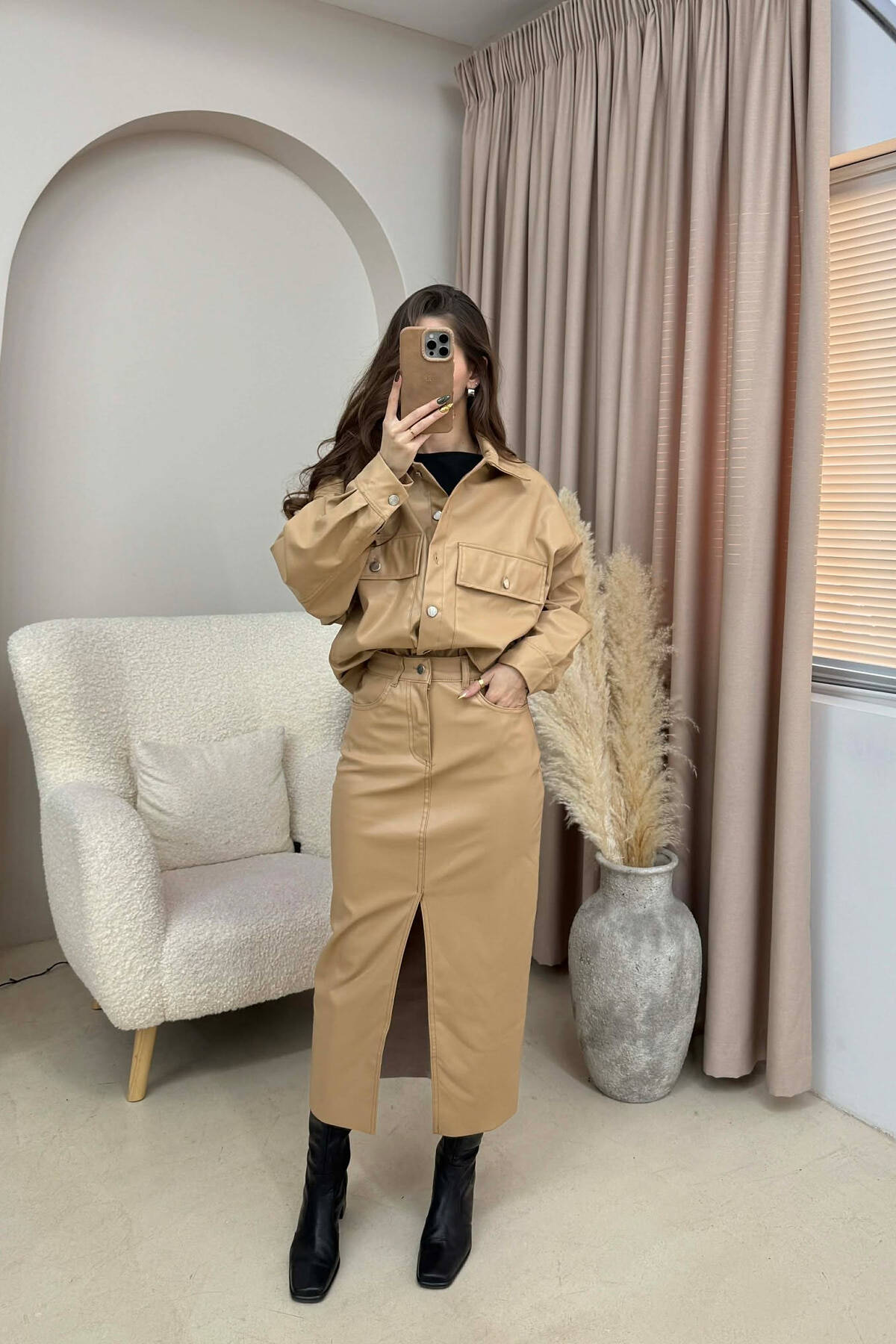 ONE COLOR LEATHER JACKET+ SKIRT WOMEN SET BEIGE/BEZHE