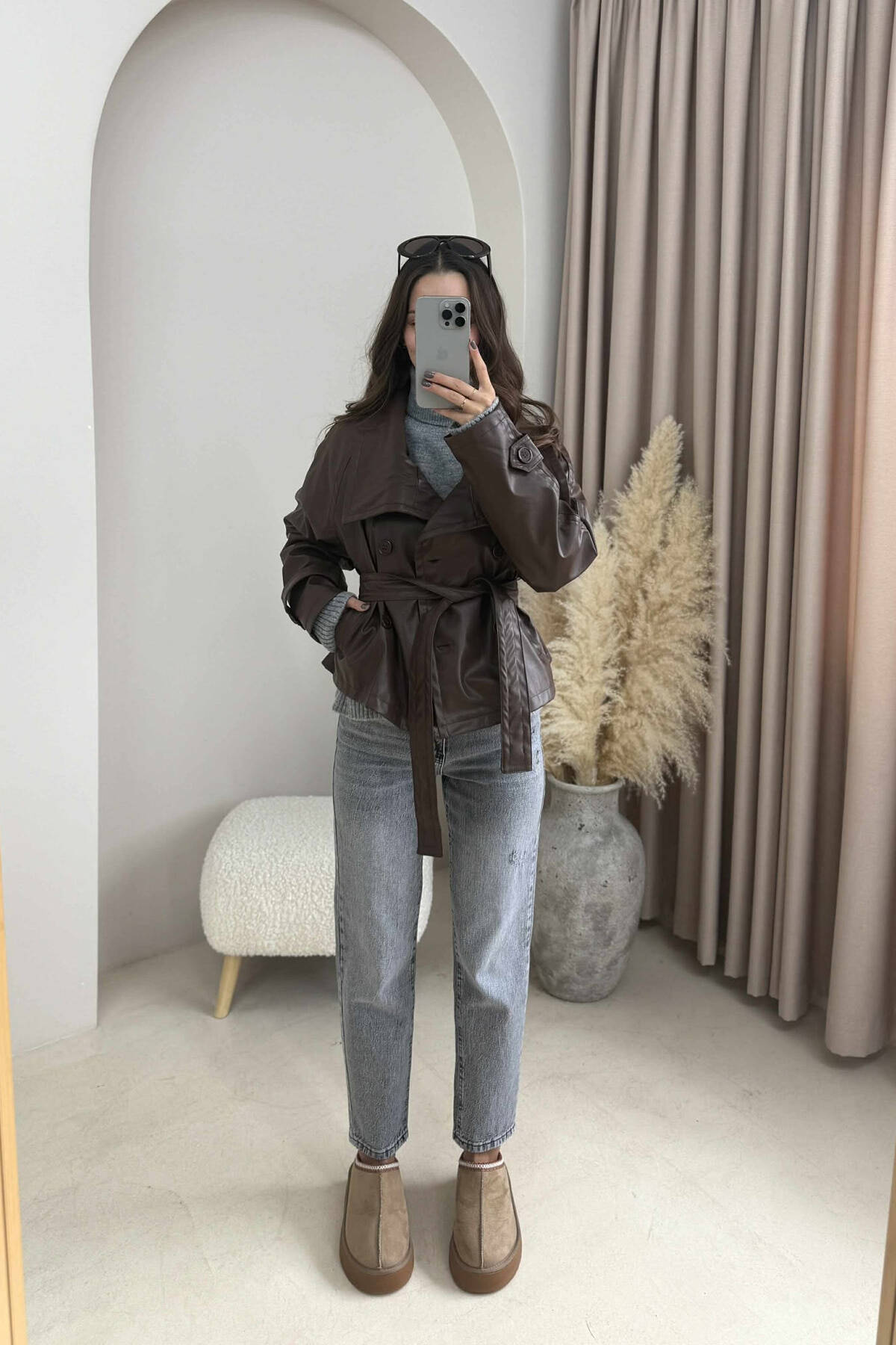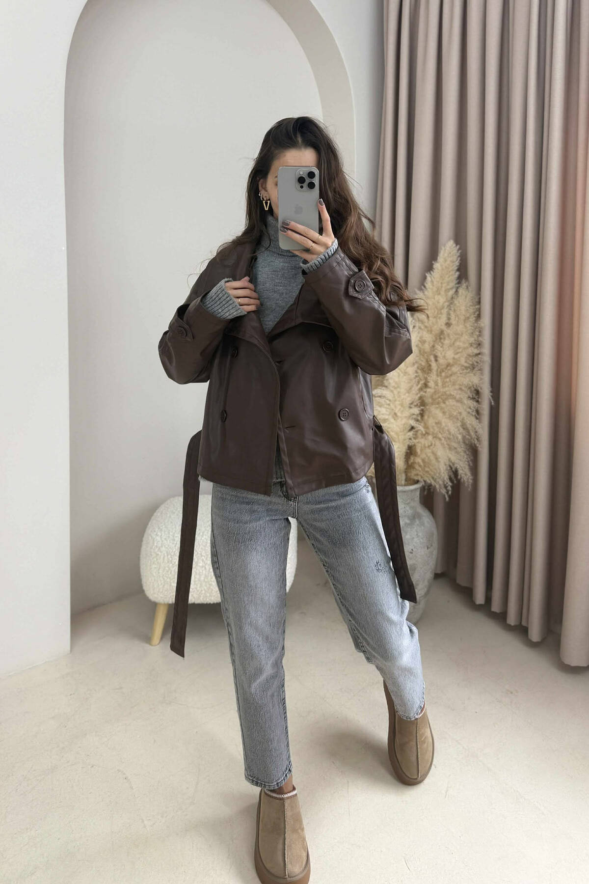 ONE COLOR LEATHER LACING WOMEN JACKET BROWN/KAFE