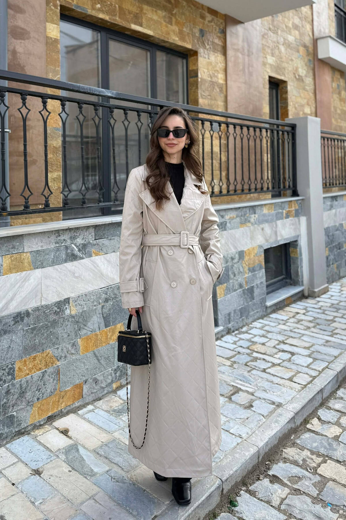 ONE COLOR LEATHER BUTTONED BELT DETAIL LONG WOMAN COAT BROWN/KAFE