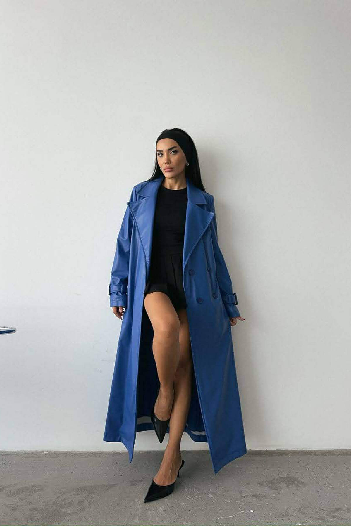 ONE COLOR LEATHER LONG WOMEN TRENCH COAT BLUE/BLU