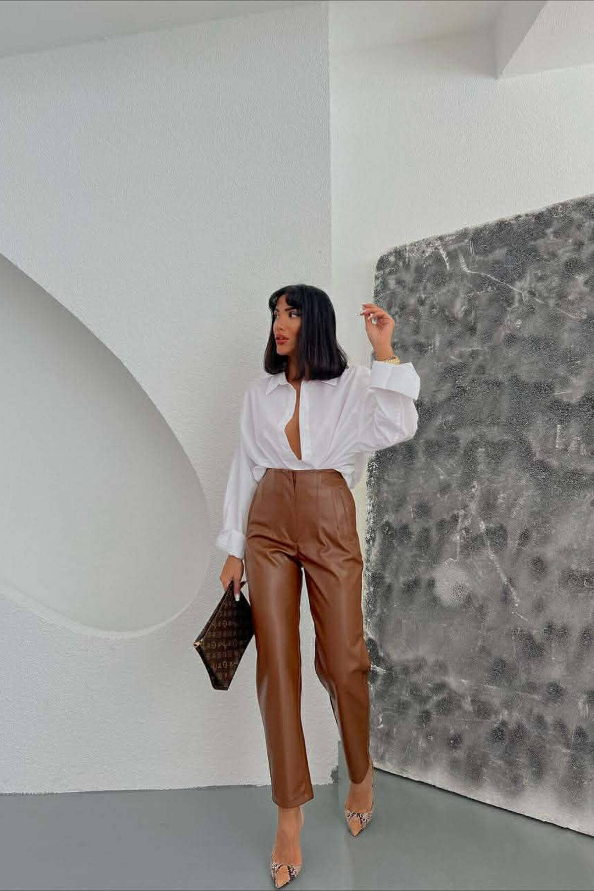 ONE COLOR LEATHER SIMPLE WOMEN TROUSERS BROWN/KAFE