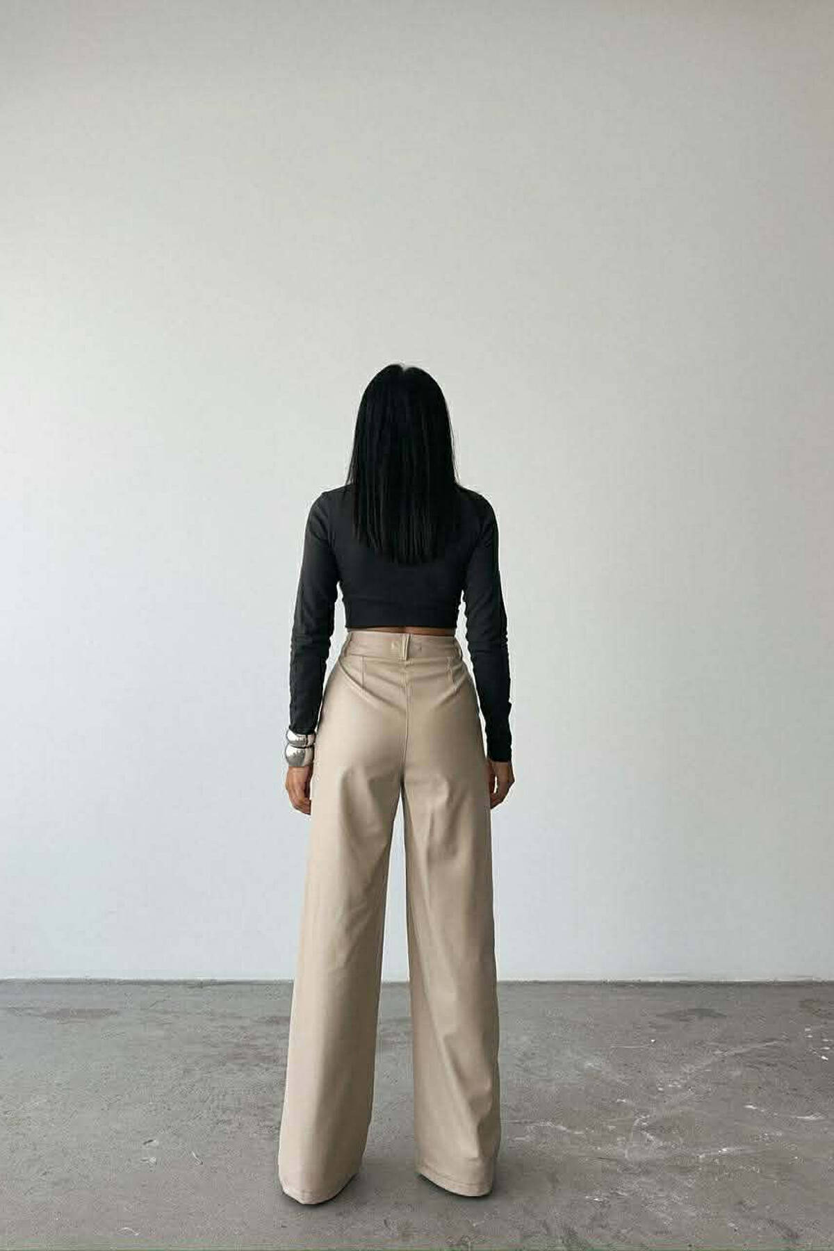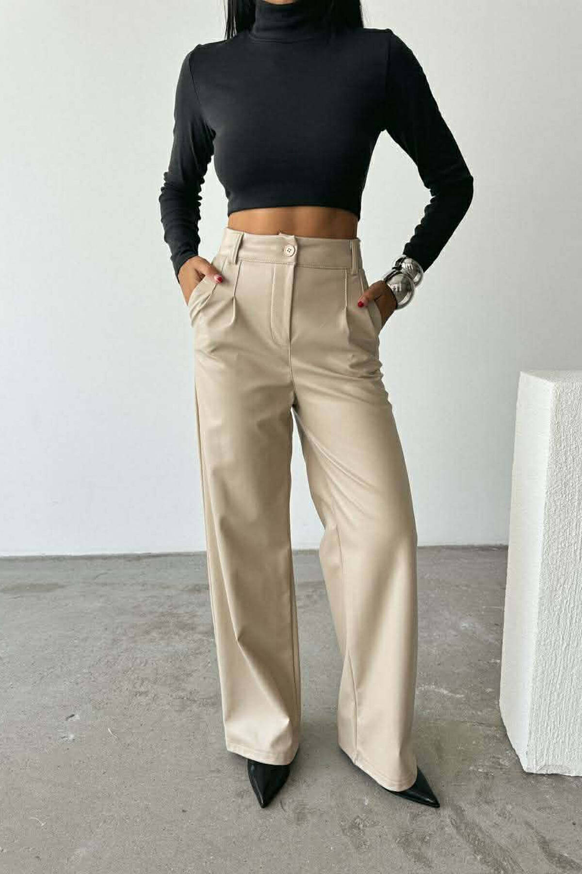 ONE COLOR LEATHER WIDE LEG WOMEN TROUSERS CREAM/KREM