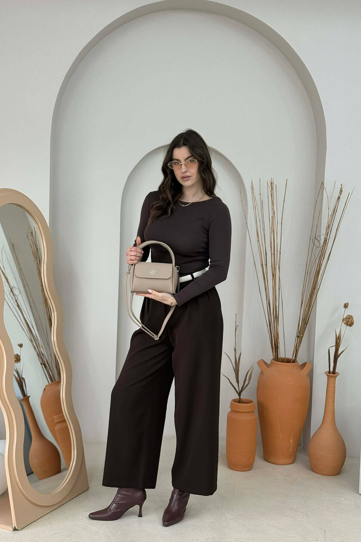 ONE COLOR LEATHER ZIPPER WOMEN BAG BROWN/KAFE