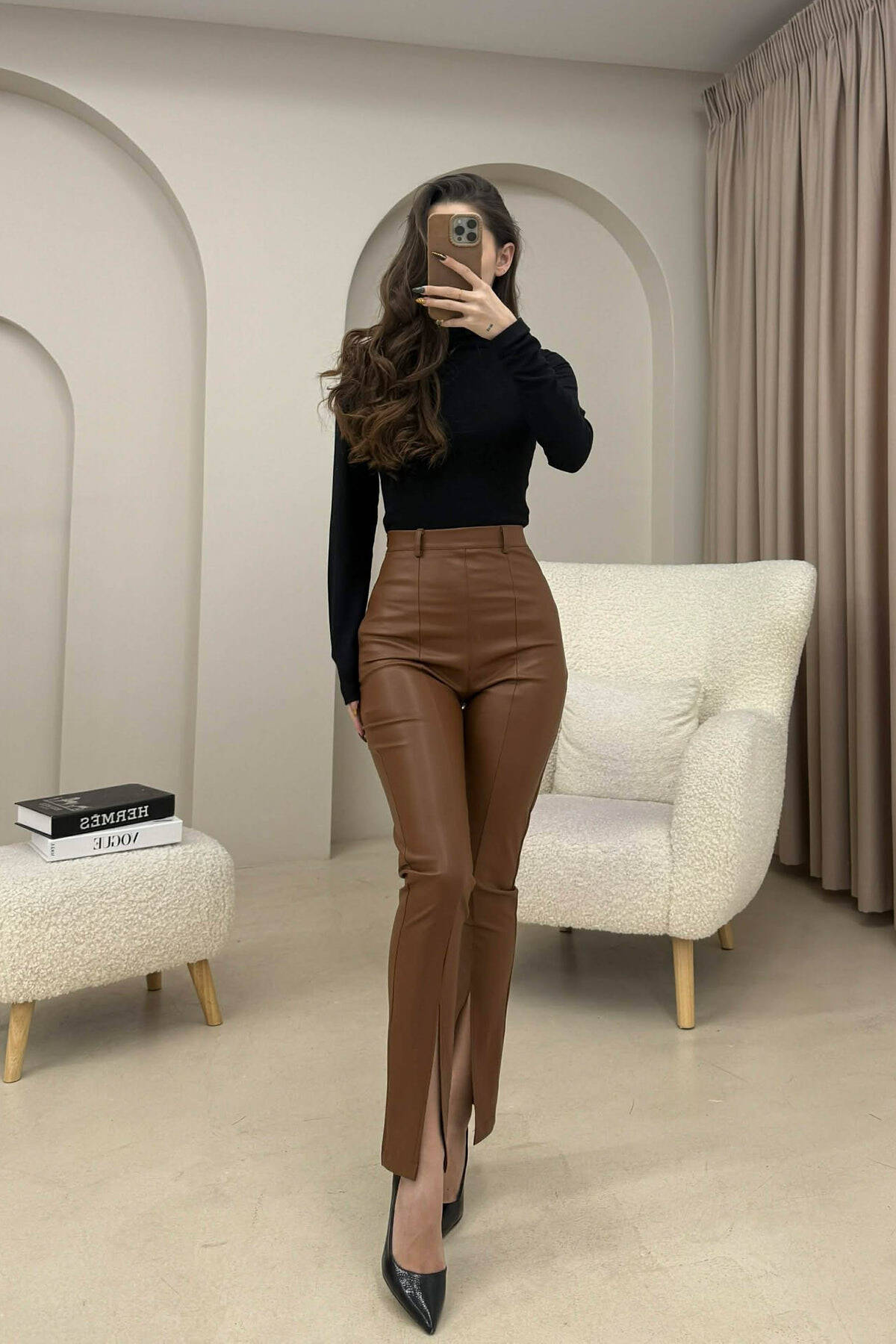 ONE COLOR LEATHER WOMEN TROUSERS BROWN/KAFE