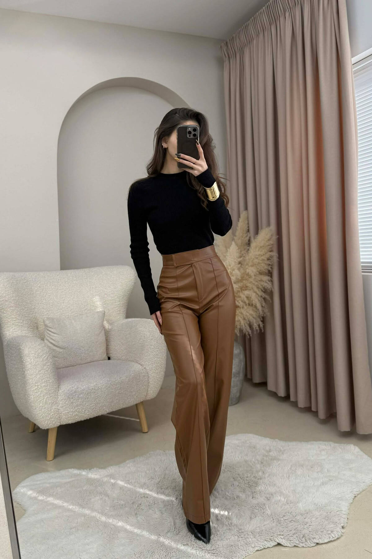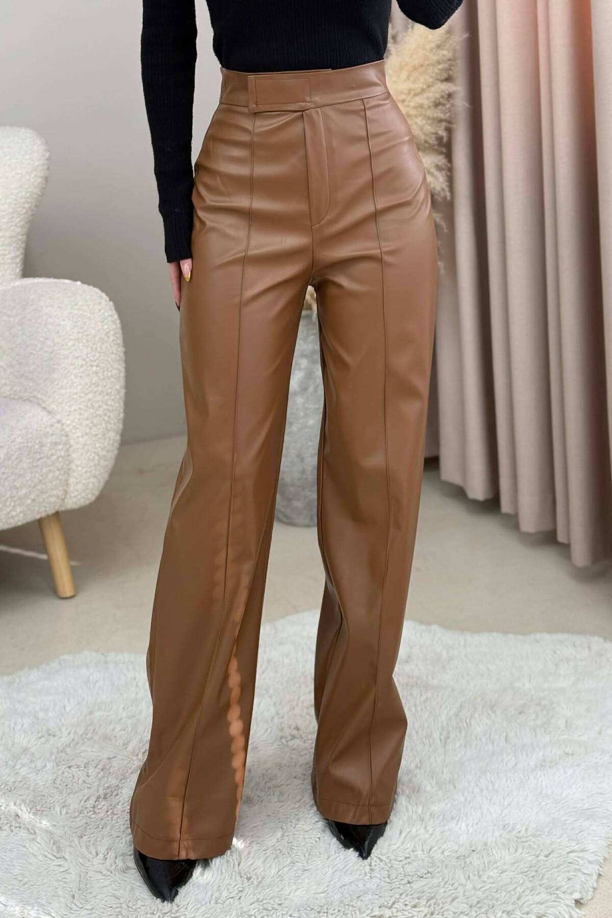 ONE COLOR LEATHER WOMEN TROUSERS BROWN/KAFE