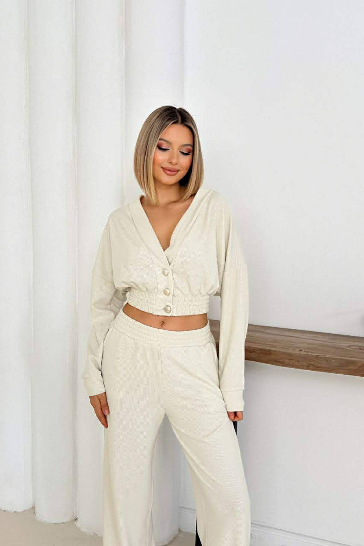 ONE COLOR LONG SLEEVE CROP TOP+TROUSERS WOMEN SET CREAM/KREM
