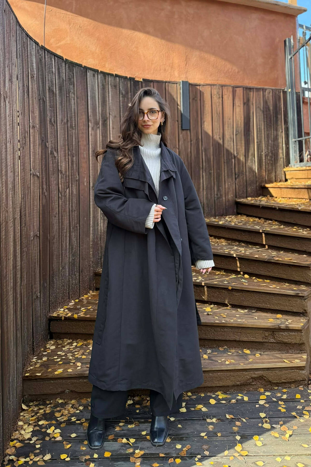 ONE COLOR LONG WOMEN TRENCH COAT BLACK/ E ZEZE