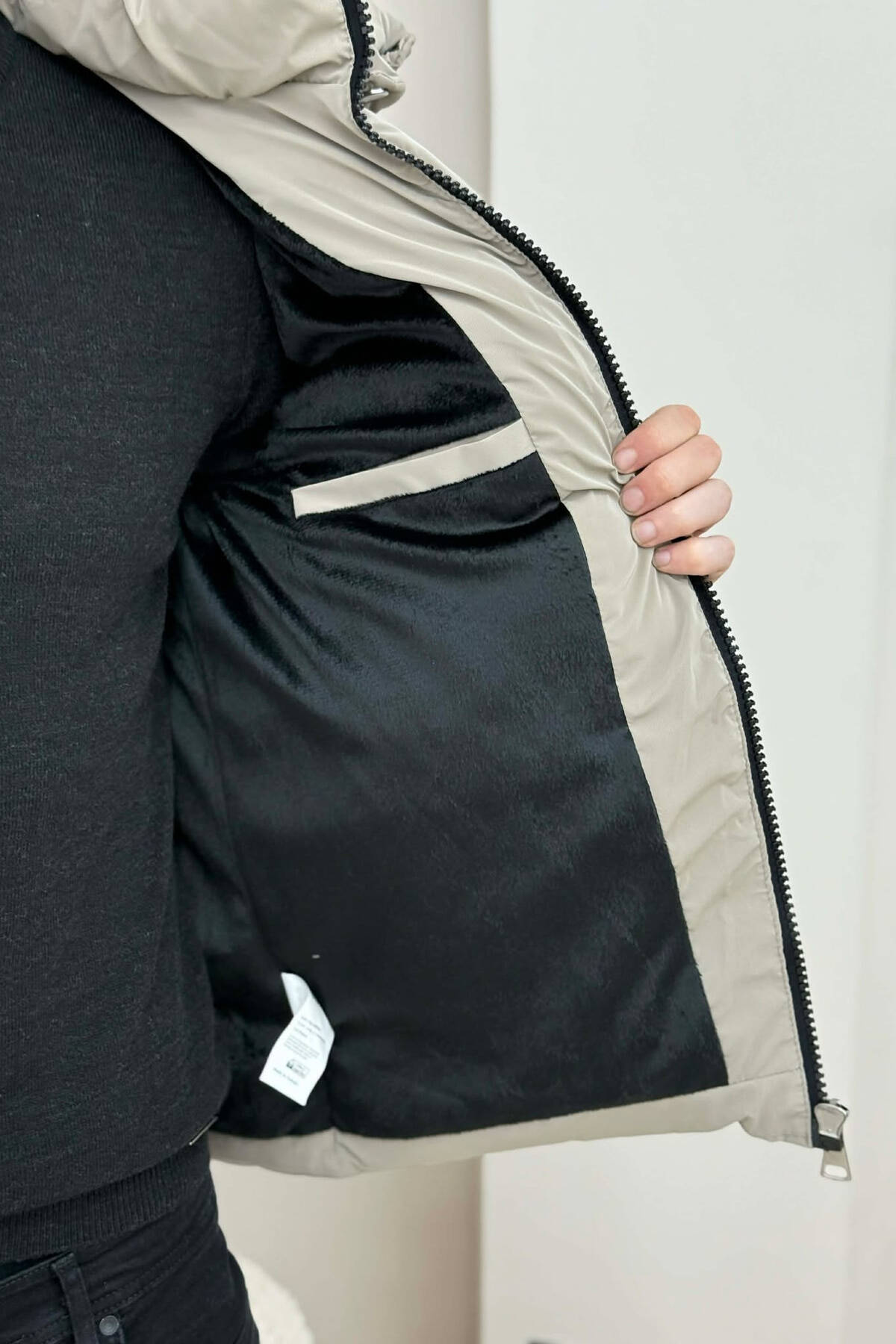 NECK AND BOTTOM BELTED FLUFFY MEN PUFFER JACKET BEIGE/BEZHE