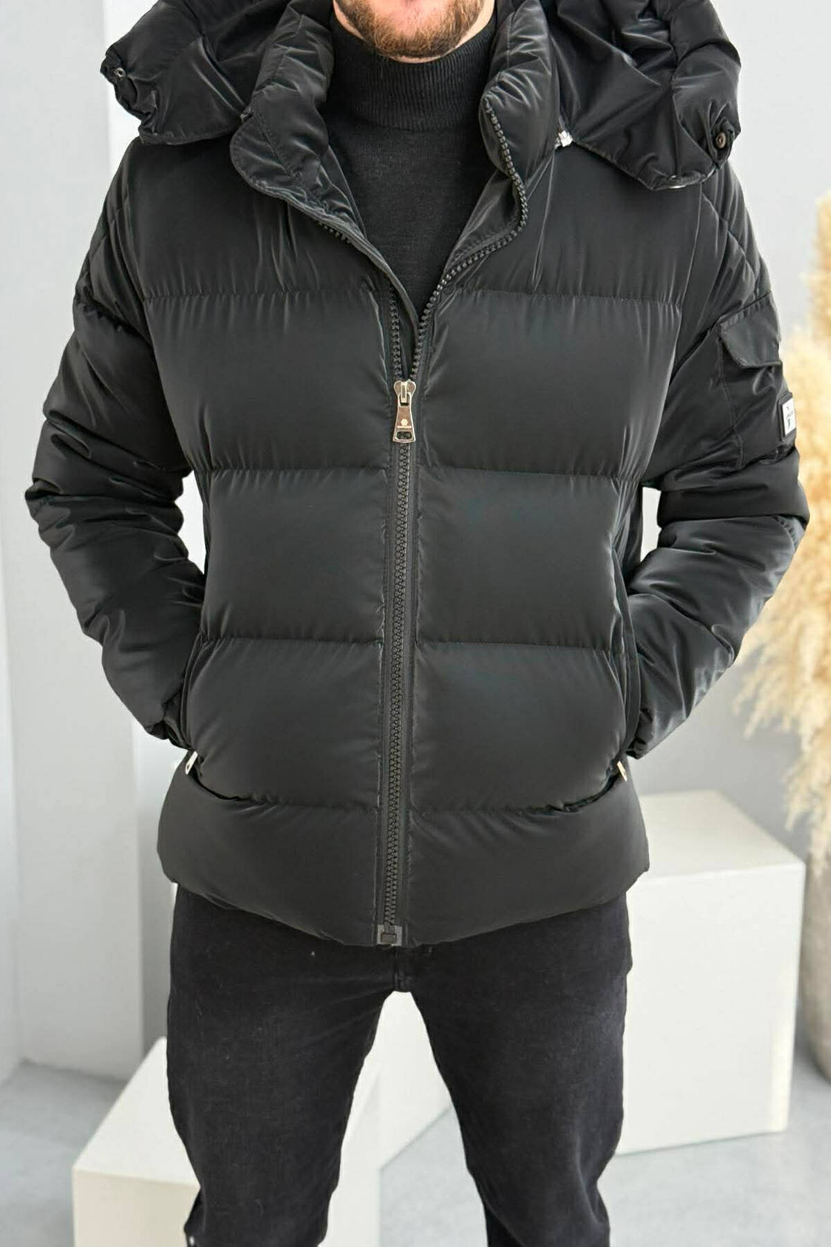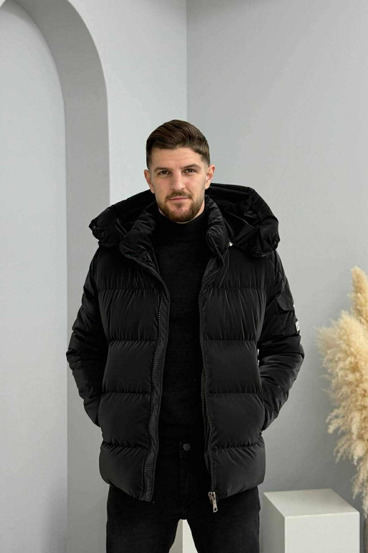 ONE COLOR FLUFFY SIDE POCKET MEN PUFFER JACKET BLACK/ E ZEZE