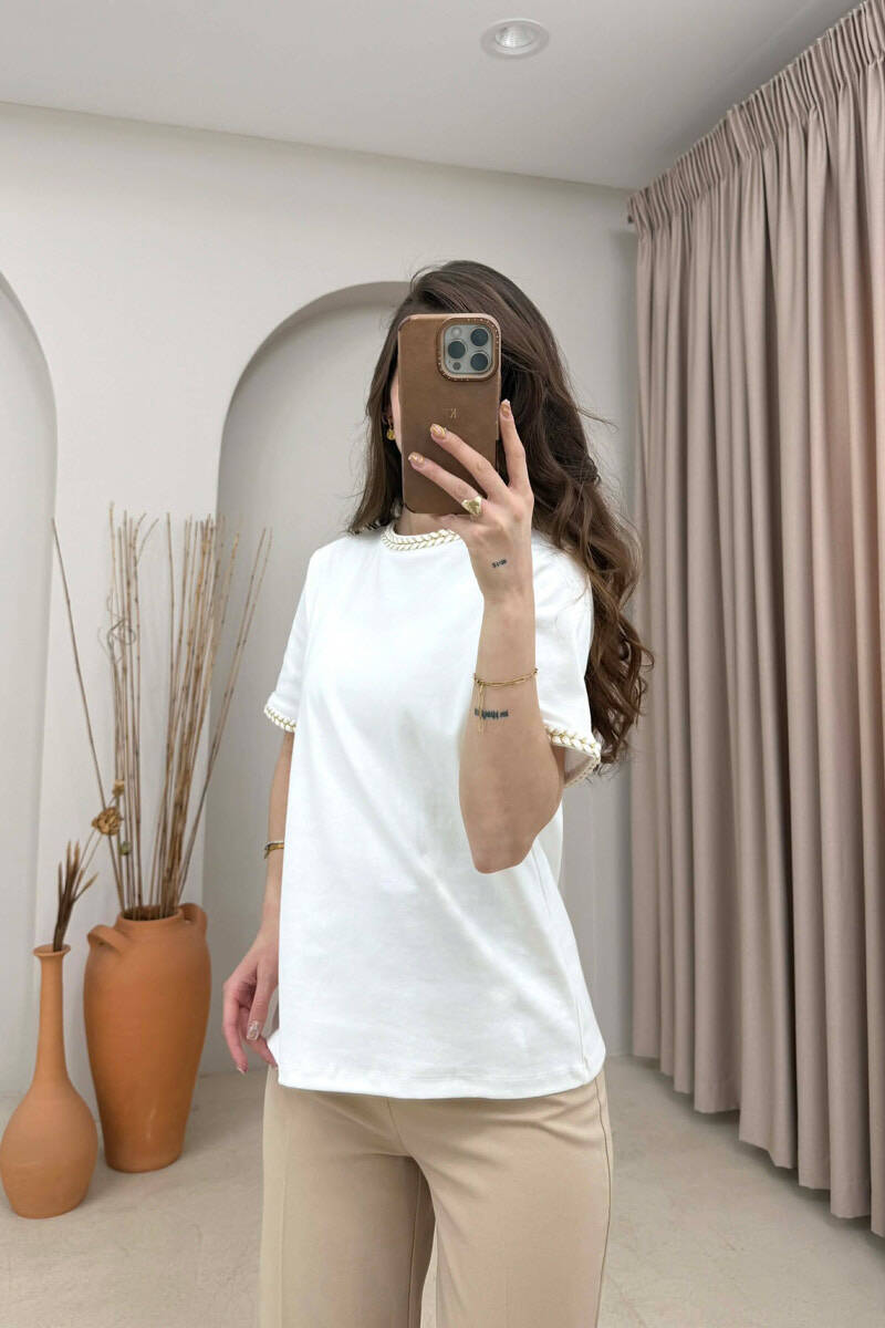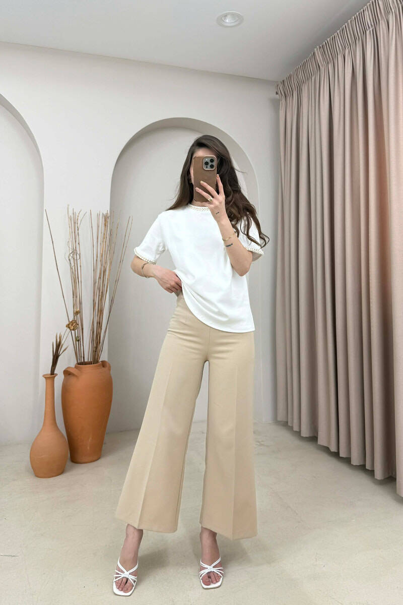 ONE COLOR NECK DETAIL WOMAN T-SHIRT CREAM/KREM
