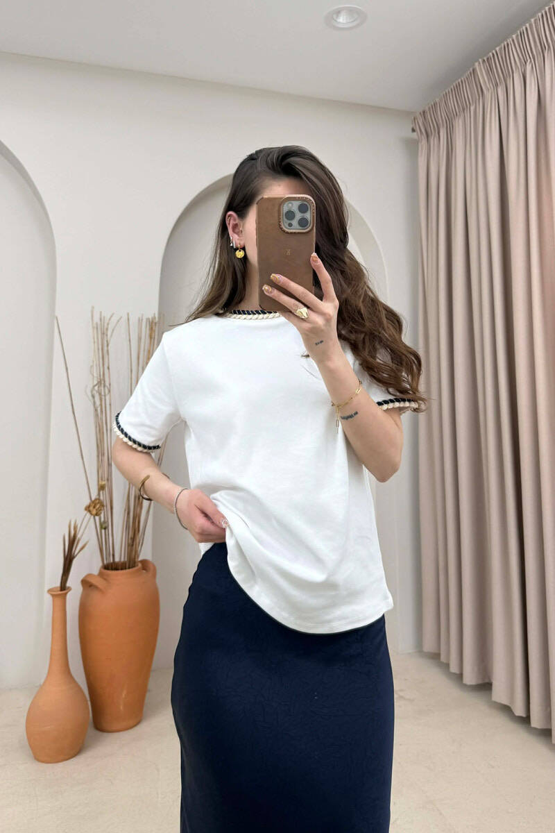 T-SHIRT ME DETAJE TEK PJESA E QAFES PER FEMRA NE NGJYRE TE BARDHE