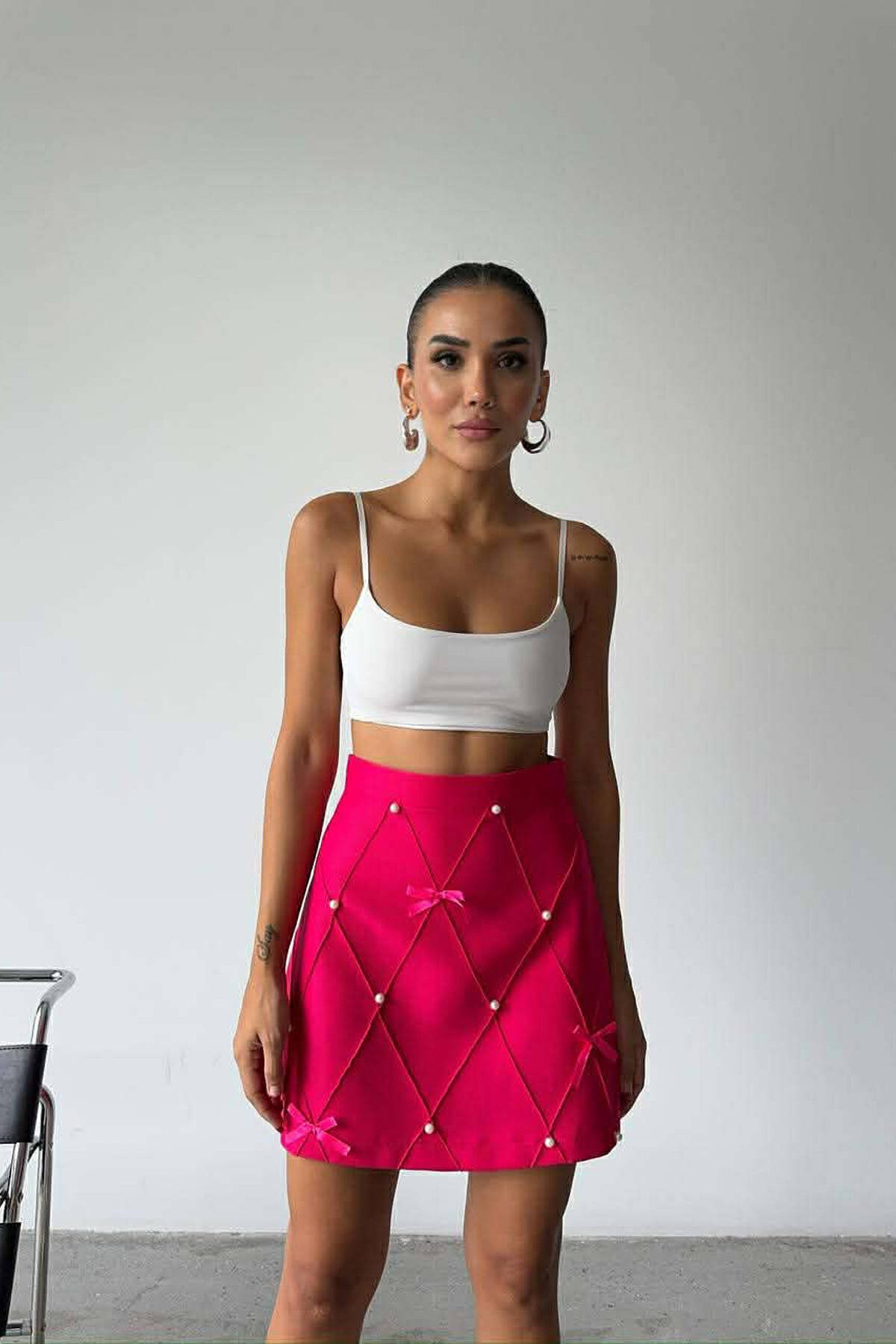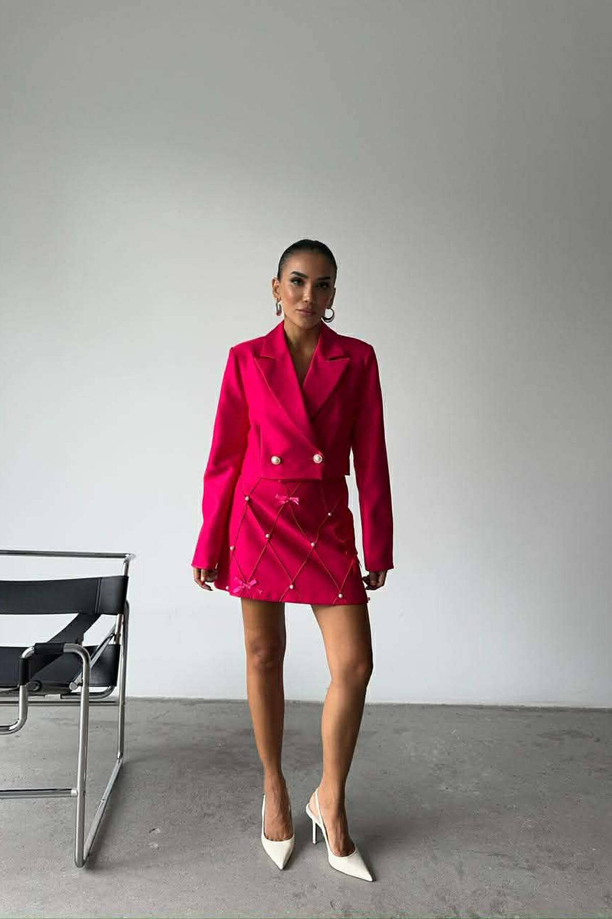 ONE COLOR PEARL DETAILS JACKET+SKIRT WOMEN SET FUCHSIA/CIKLAMI