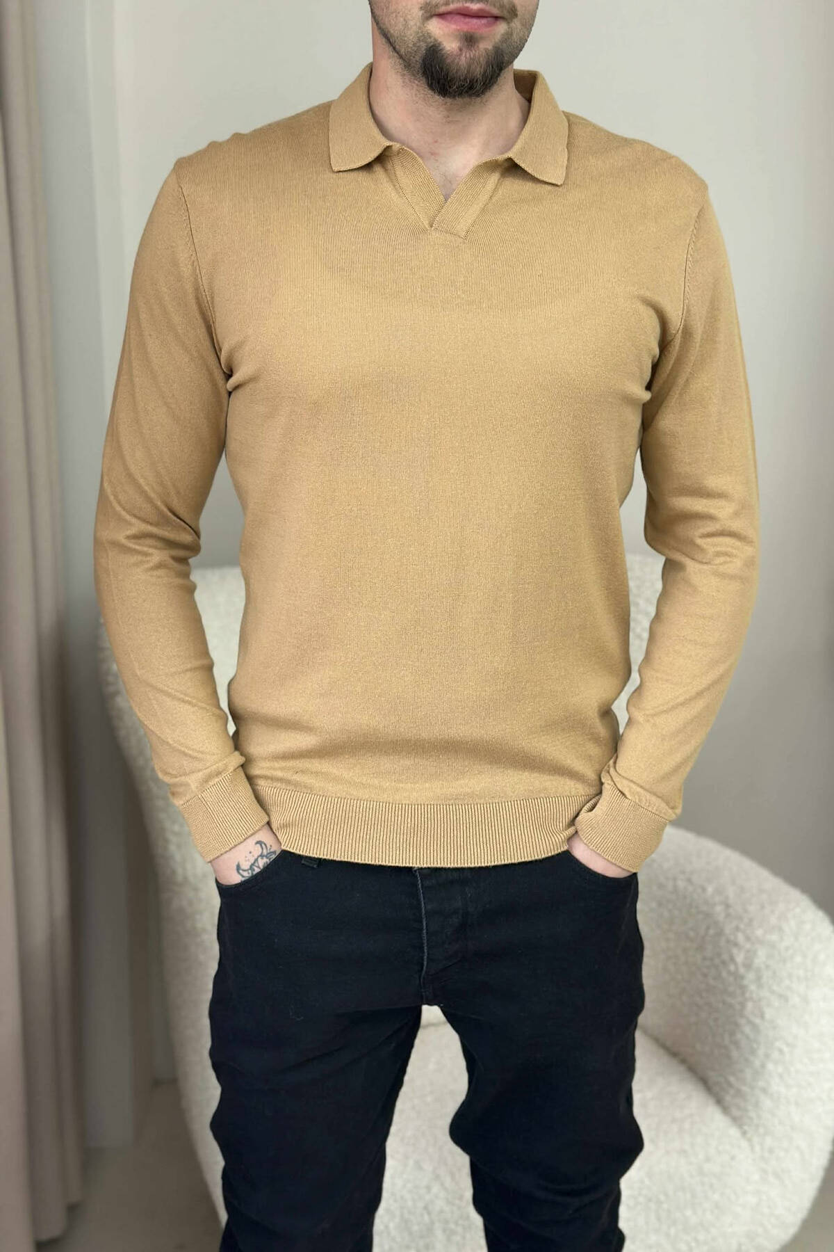 TRIKO NJËNGJYRËSHE ME JAKË POLO PËR MESHKUJ NË NGJYRËN KAFE TË ZBARDHUR