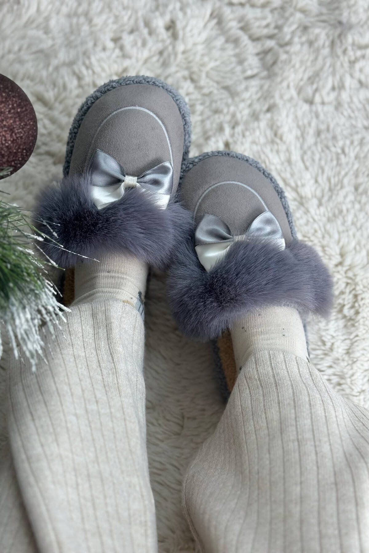 ONE COLOR RIBBON DETAIL WOMAN TEDDY SLIPPERS DARK GREY/GEE