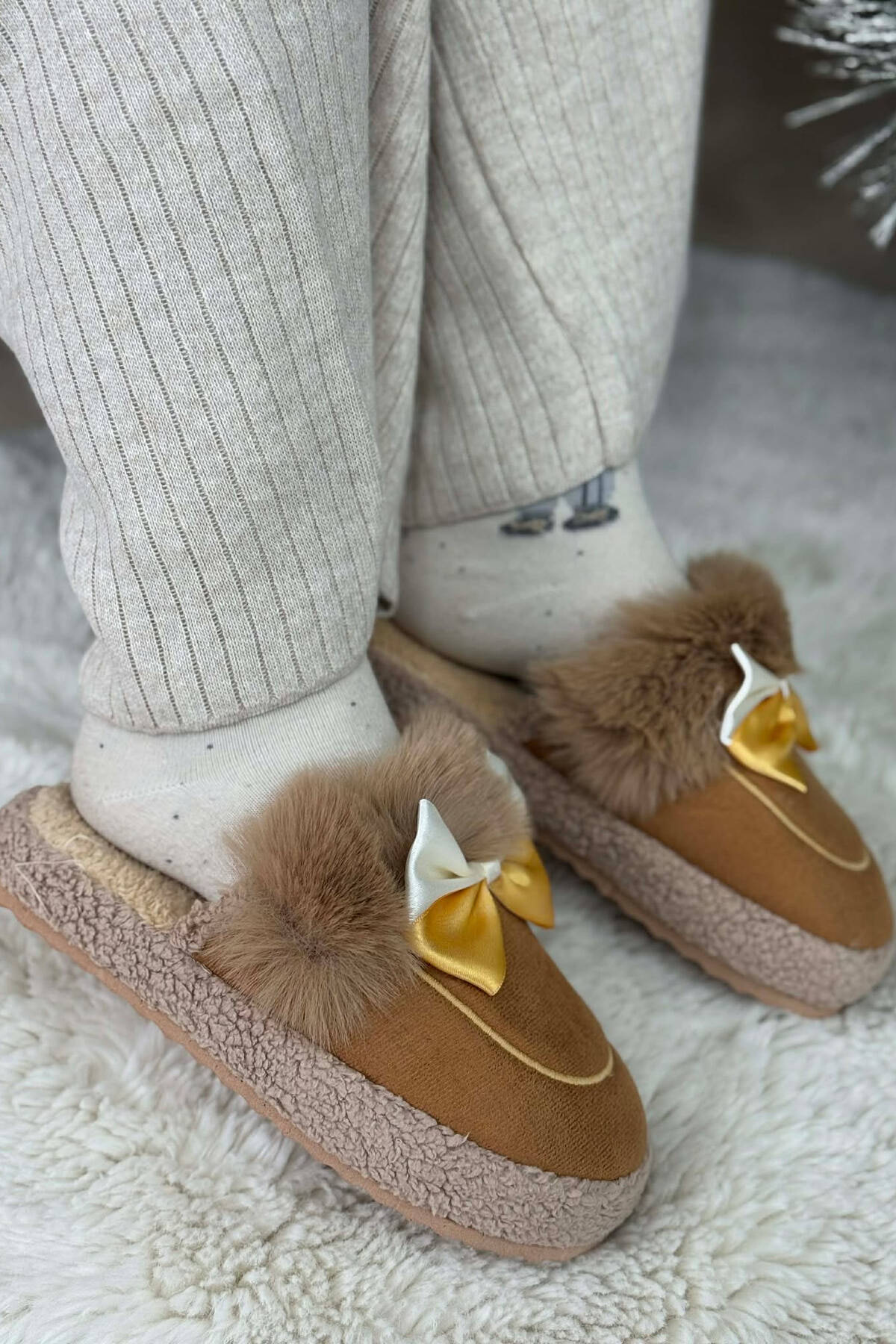 ONE COLOR RIBBON DETAIL WOMAN TEDDY SLIPPERS LIGHT BROWN/KAZB