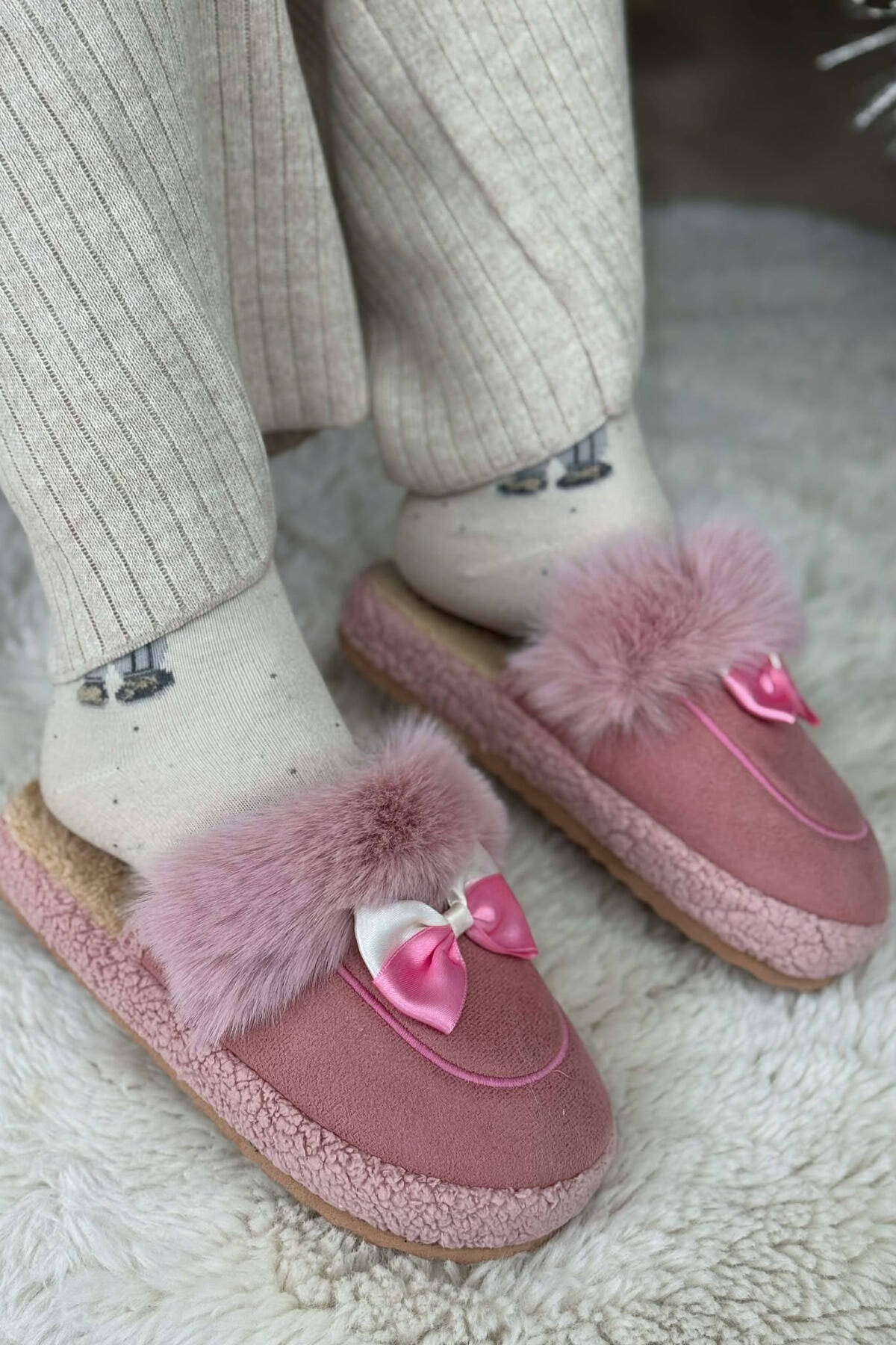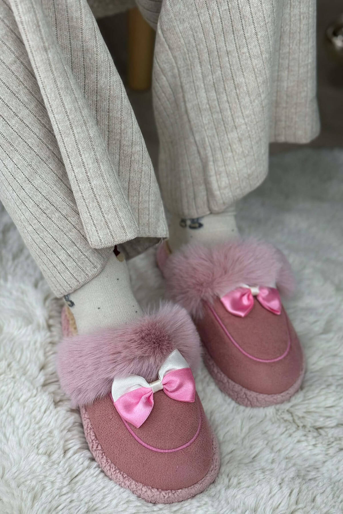 ONE COLOR RIBBON DETAIL WOMAN TEDDY SLIPPERS PINK/ROZE
