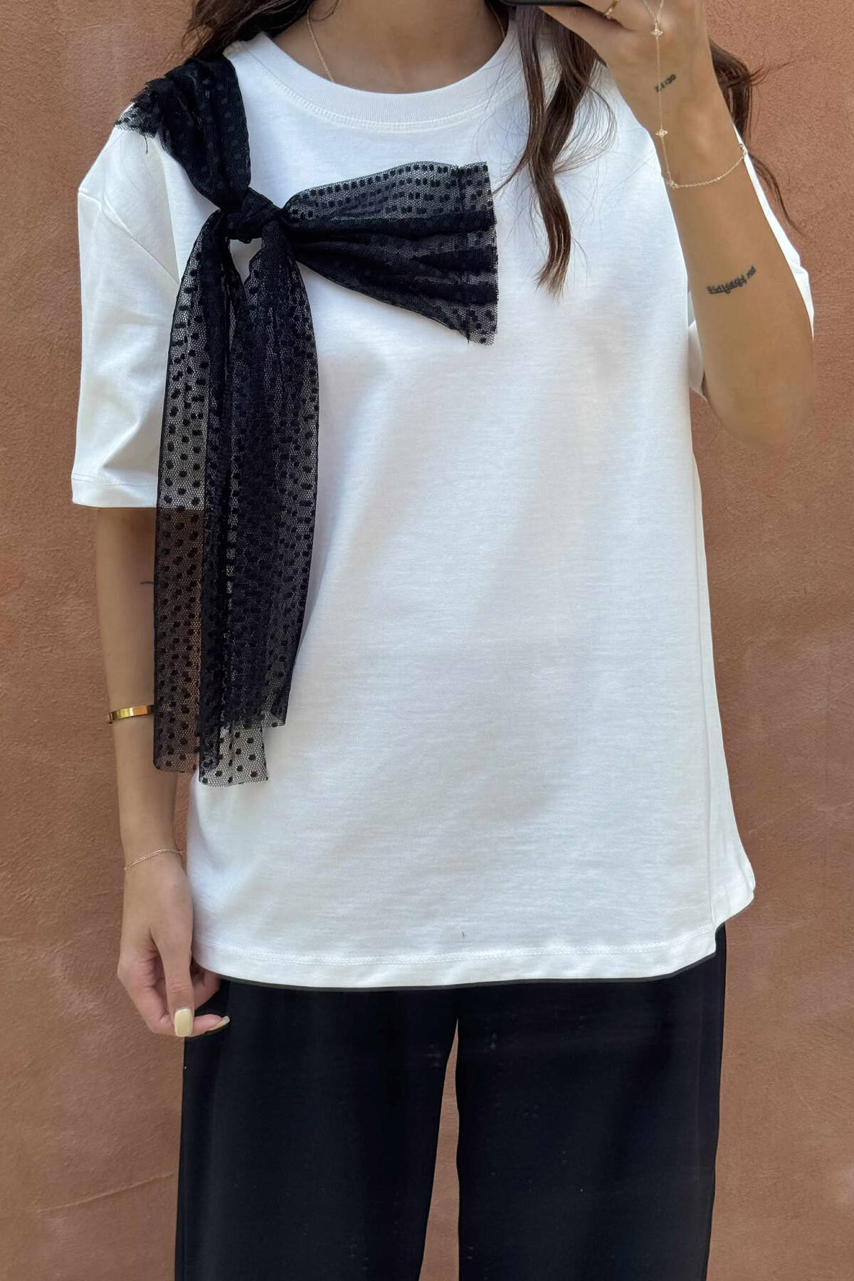 ONE COLOR RIBBON DETAIL WOMEN T-SHIRT WHITE-E BARDHE