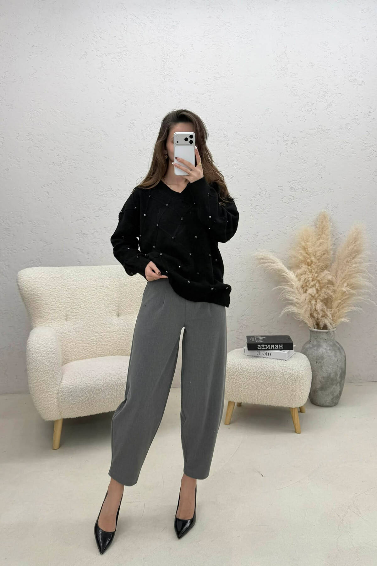 XHINSE PËR FEMRA ME DETAJIN E RRIPAVE NË NGJYRË TE ZEZE