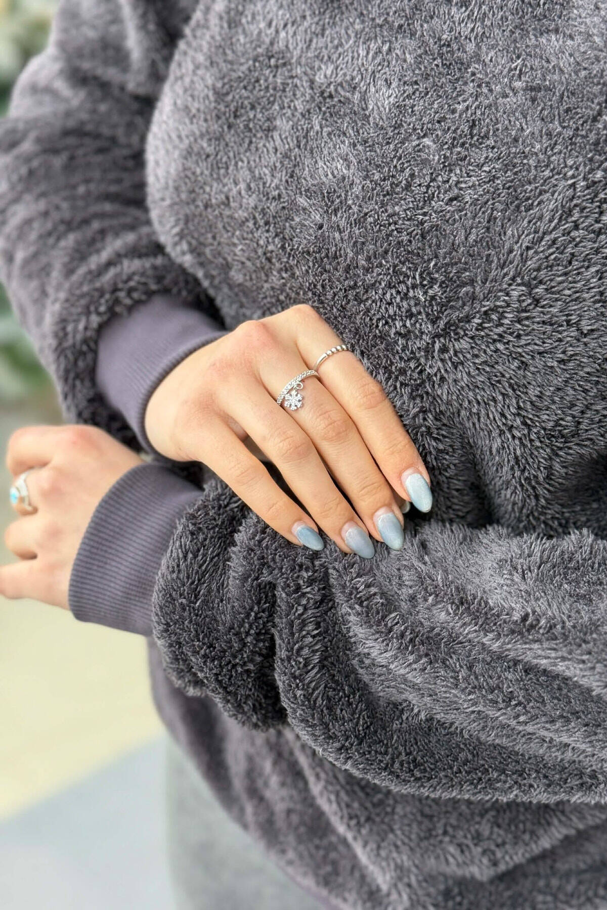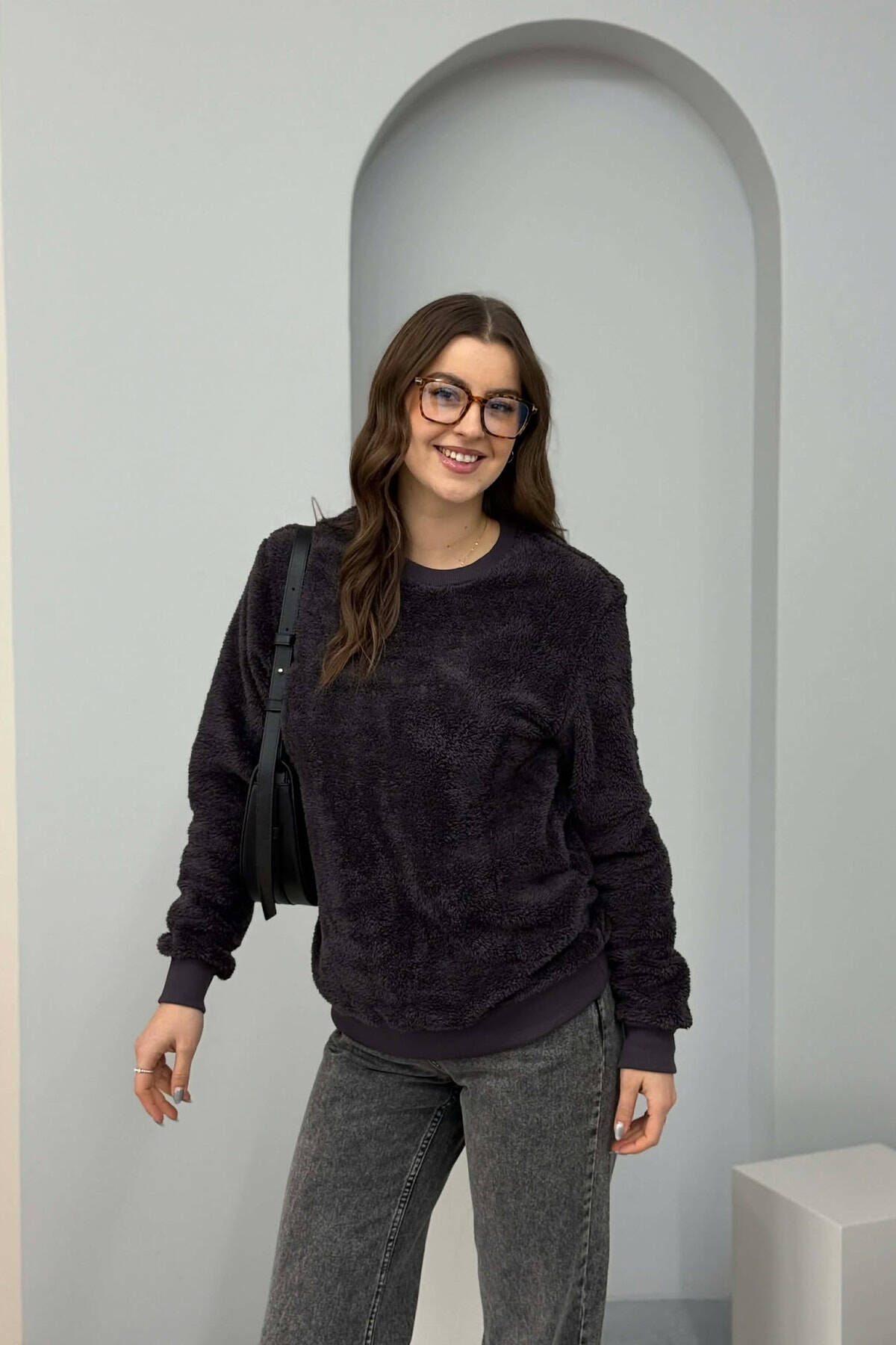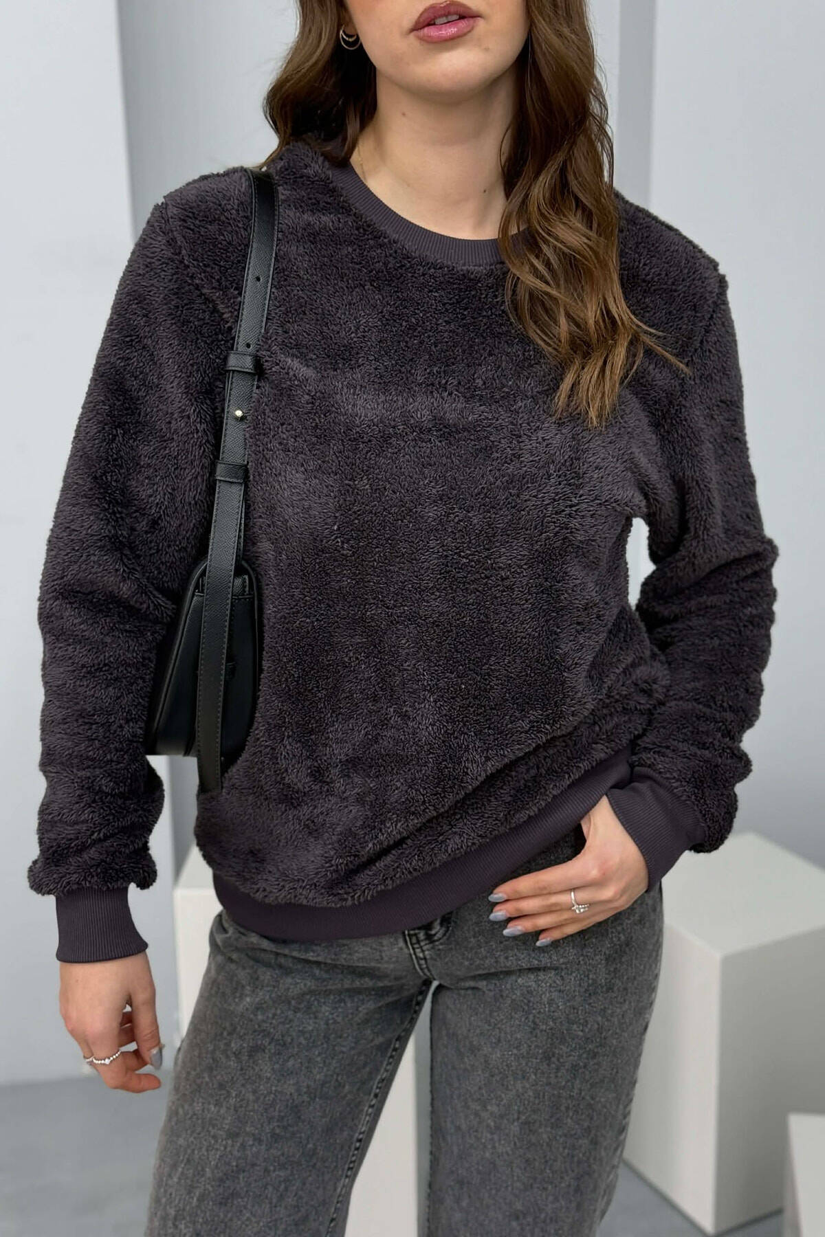 ONE COLOR ROUND NECK FLUFFY WOMEN SWEATSHIRT DARK GREY/GEE