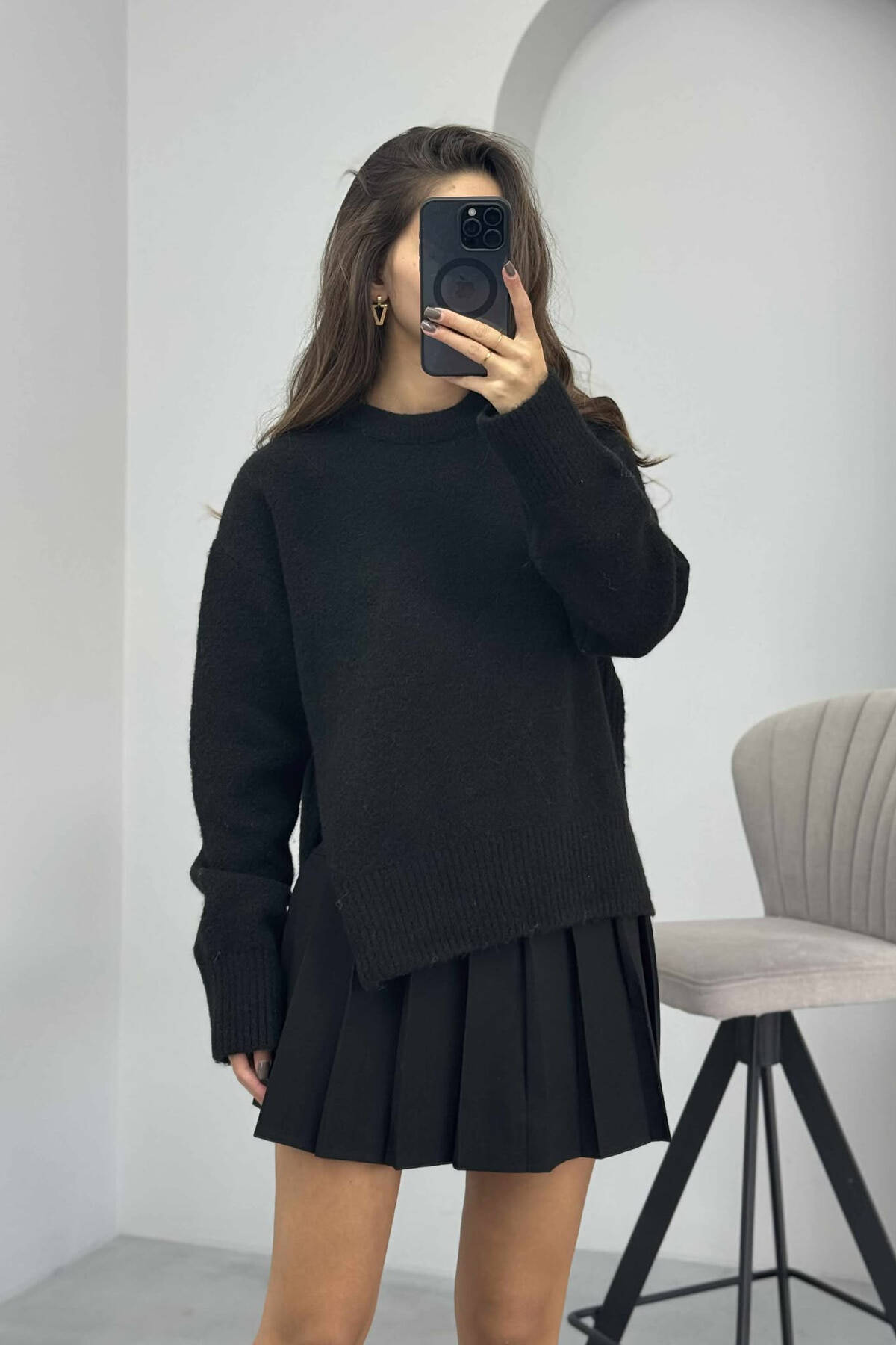 ONE COLOR ROUND NECK KNITTED WOMEN SWEATER BLACK/ E ZEZE
