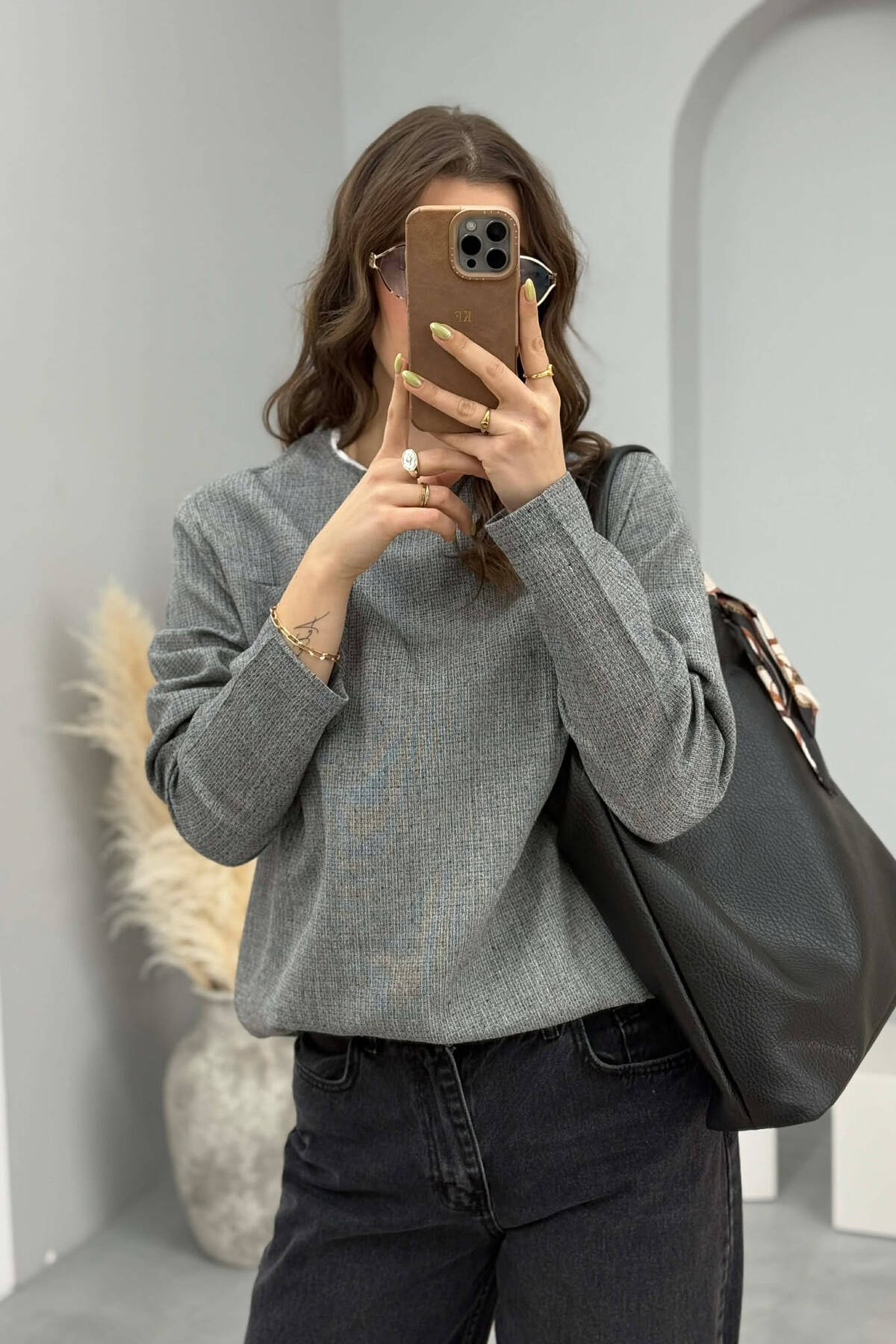 ONE COLOR ROUND NECK POCKET DETAIL WOMEN SWEATSHIRT GREY/GRI