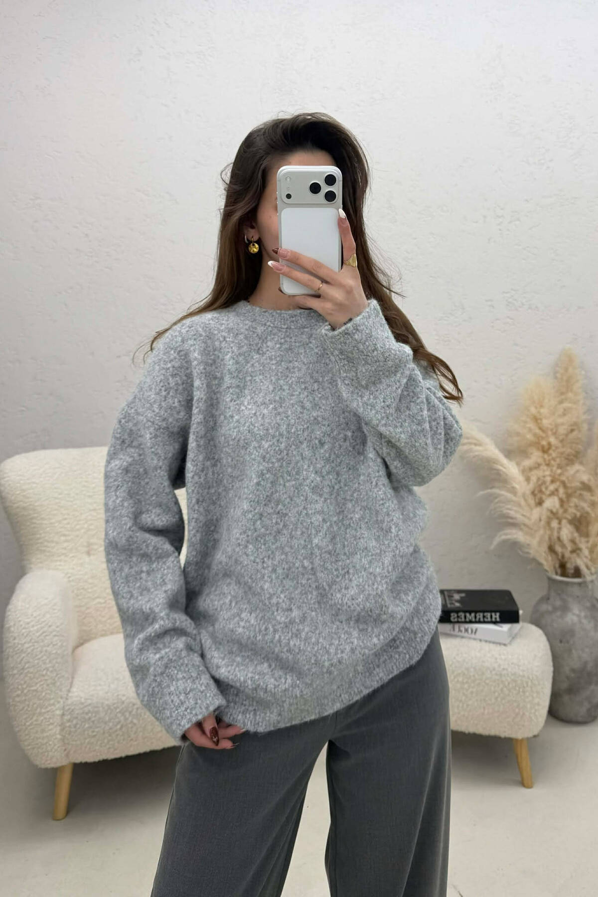 ONE COLOR ROUND NECK WOMEN SWEATER GREY/GRI