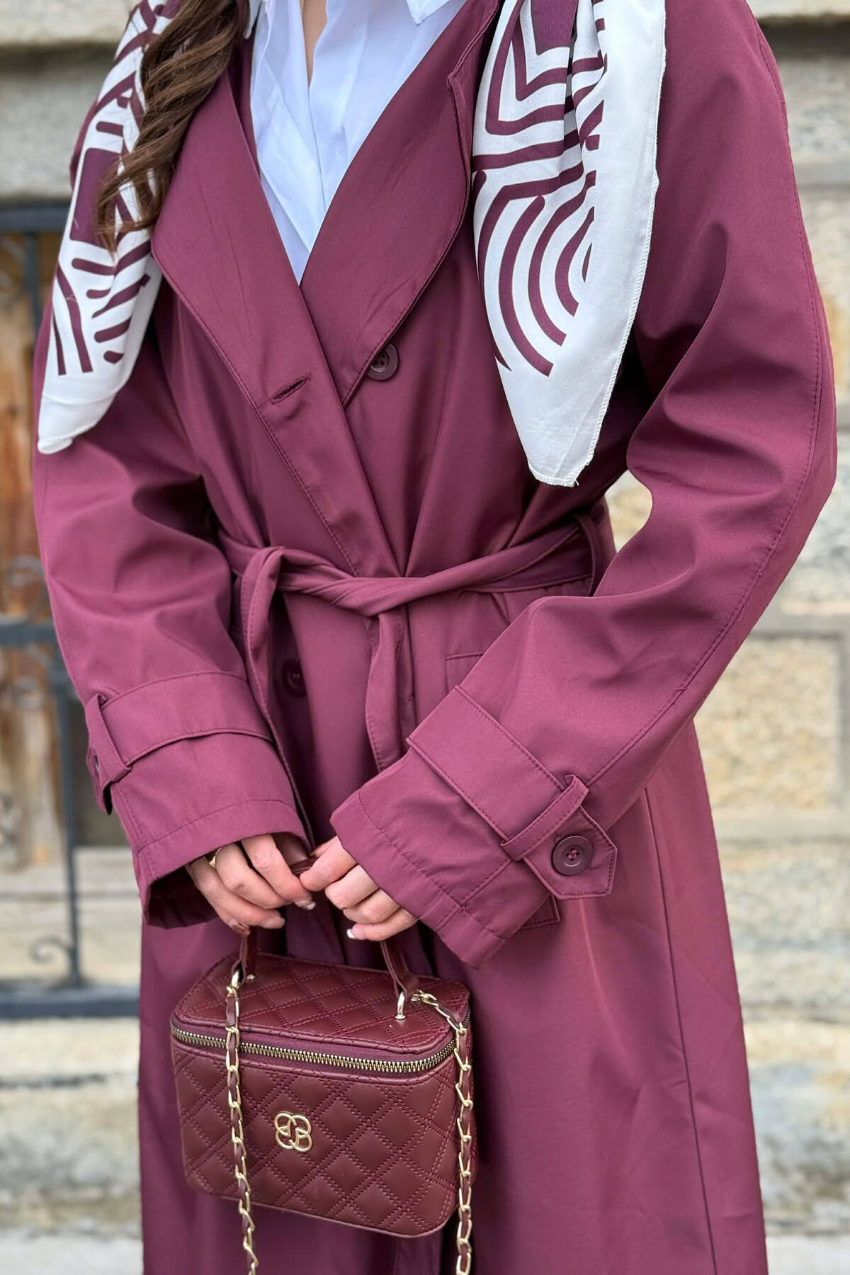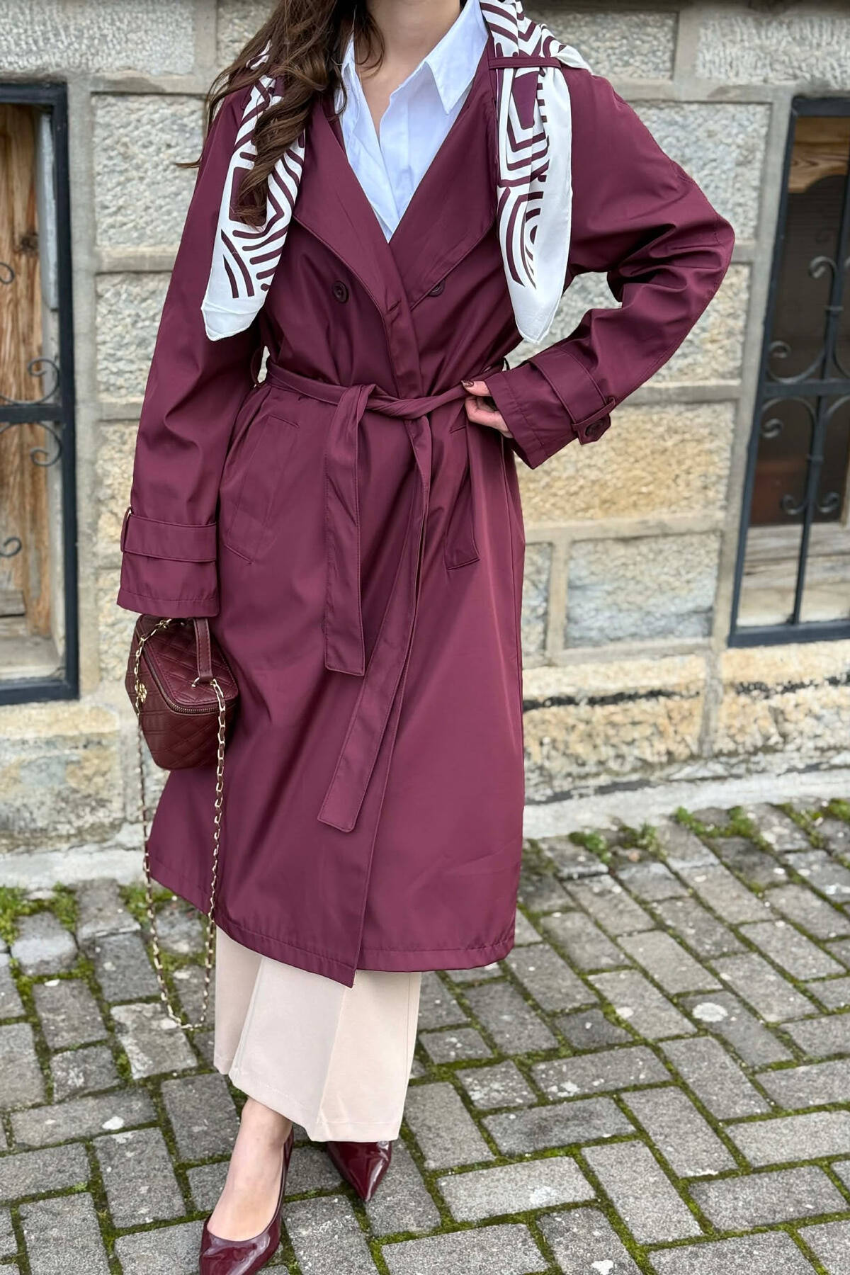 ONE COLOR SCARF AND BELT DETAIL LONG WOMEN TRENCH COAT BURGUNDY/VISHNJE
