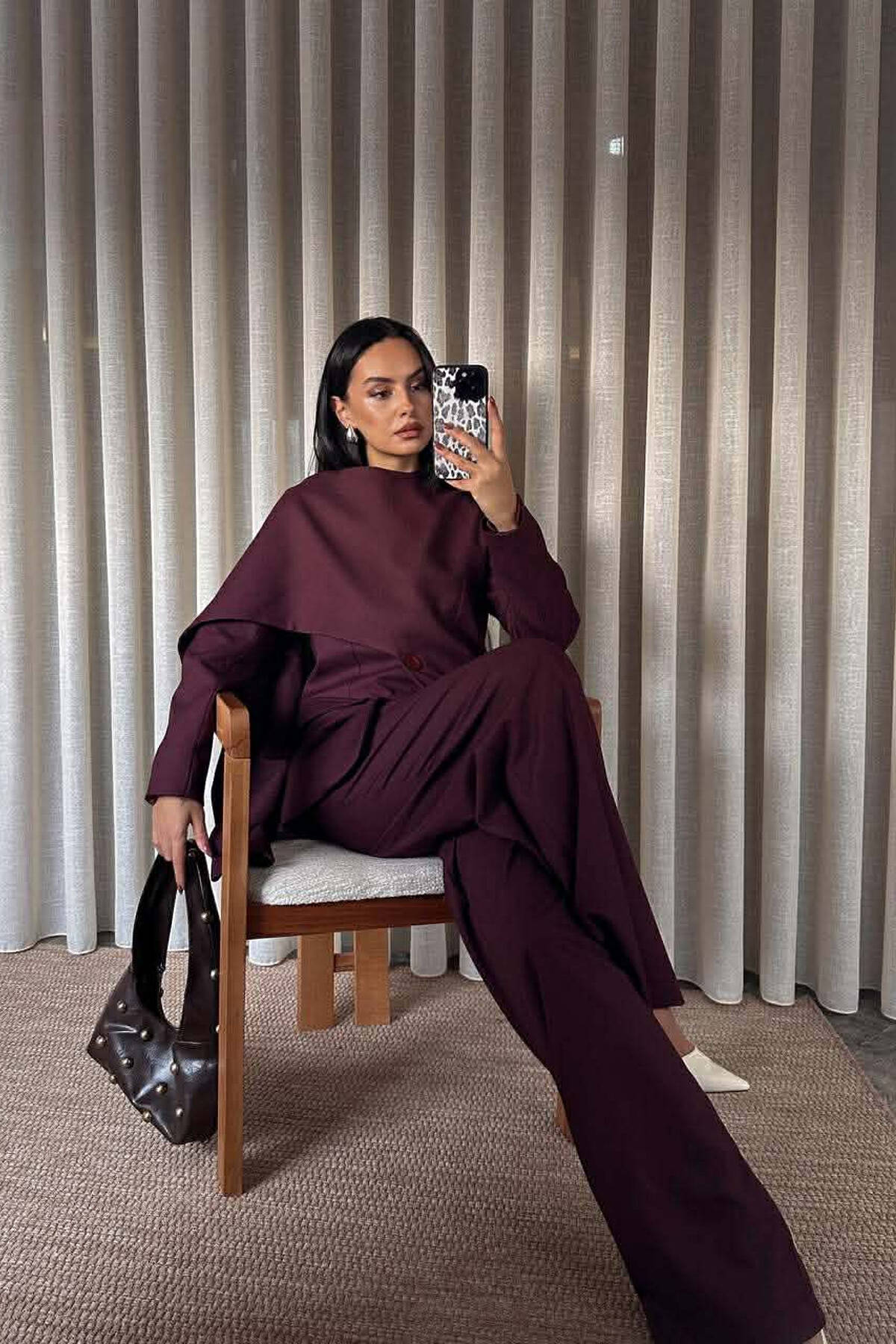 ONE COLOR SCARF DETAIL JACKET+TROUSERS WOMEN SET BURGUNDY/VISHNJE