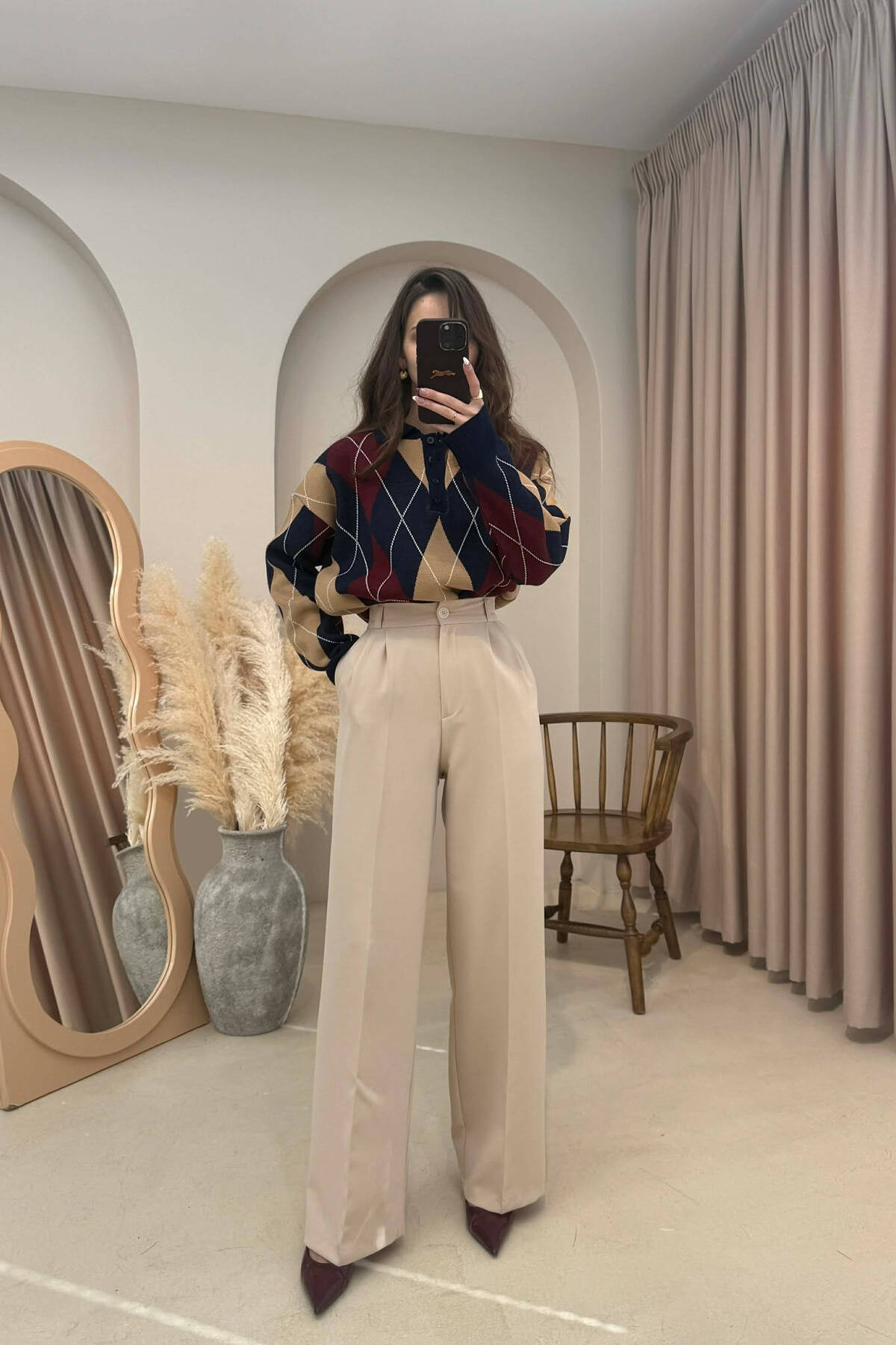 PLAID DESIGN WIDE LEG WOMAN TROUSERS BROWN/KAFE