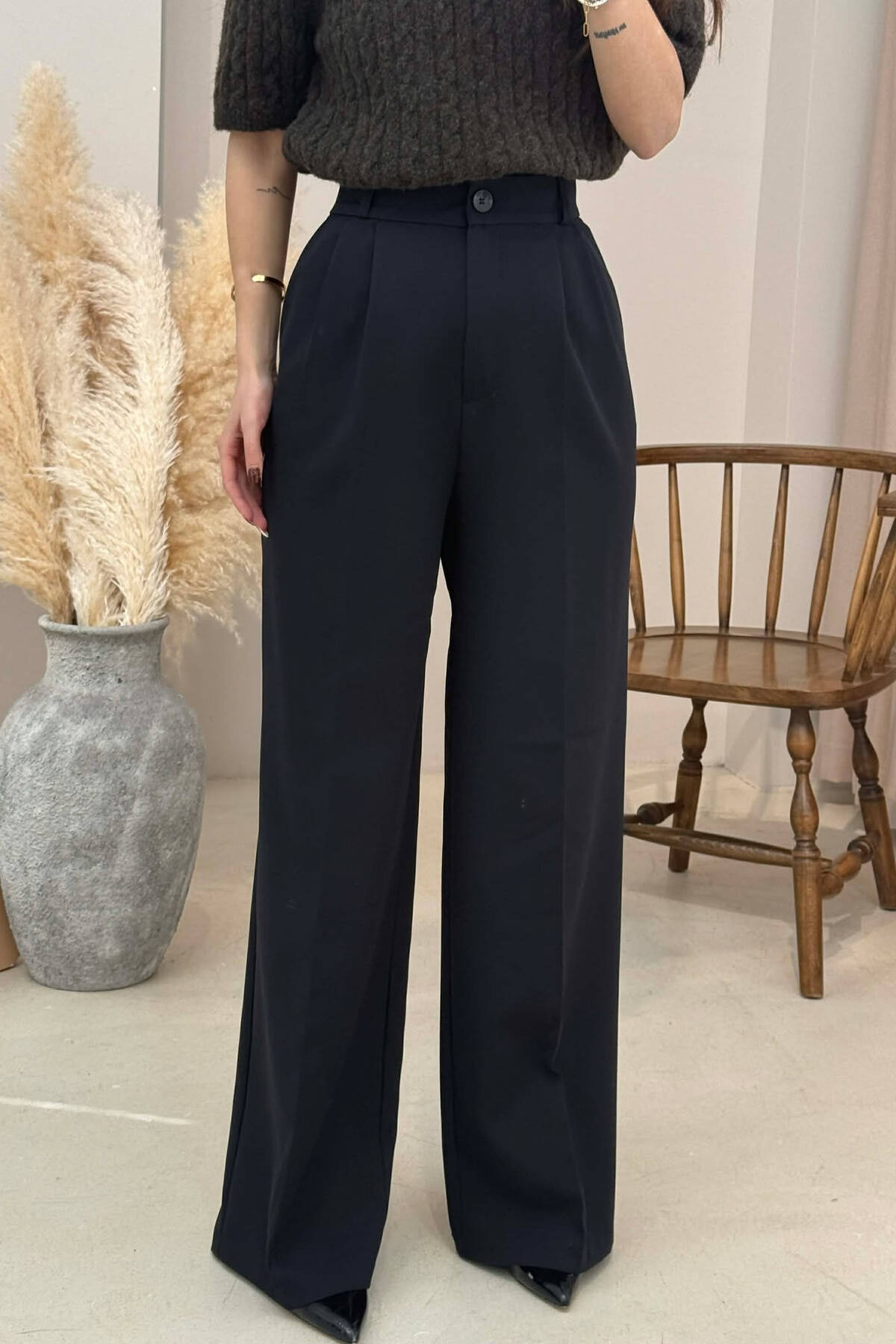 ONE COLOR WIDE LEG BELT DETAIL WOMAN TROUSERS BLACK/ E ZEZE