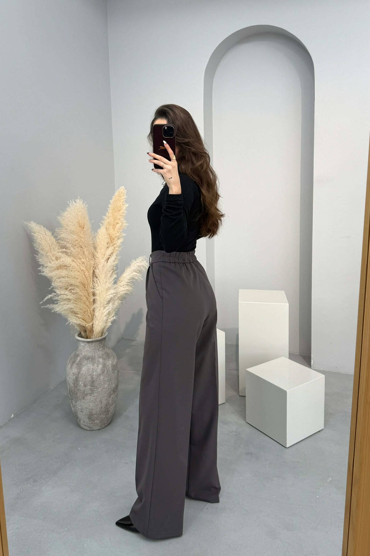 ONE COLOR SEMI ELASTIC WAIST WOMEN TROUSERS DARK GREY/GEE